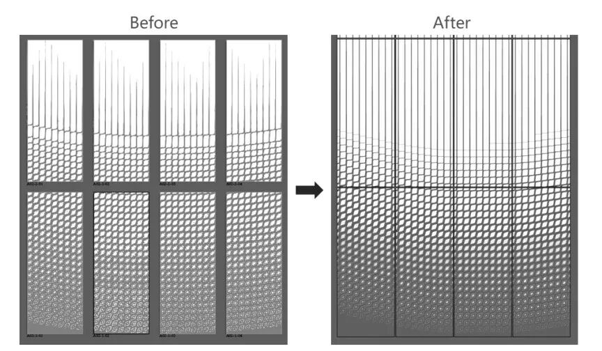 彩釉打印在复合多曲的幕墙上时,会产生整体形变。在深化设计中,我们先将多曲玻璃拍平为平面玻璃进行附图,再校核图案对应到多曲玻璃上所产生的形变效果是否理想可控。