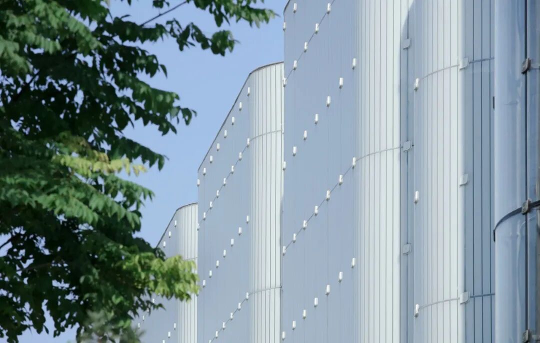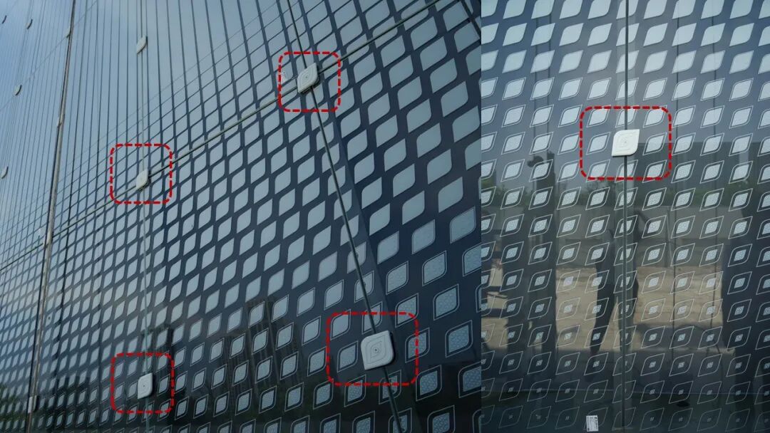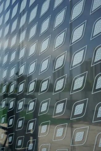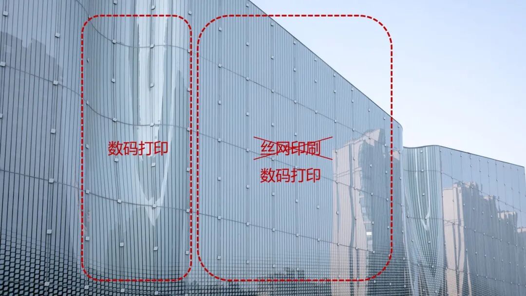 当彩釉印刷到曲面幕墙时,会产生新的问题。需要进行进一步的图案核对、色差处理,和图案适配。