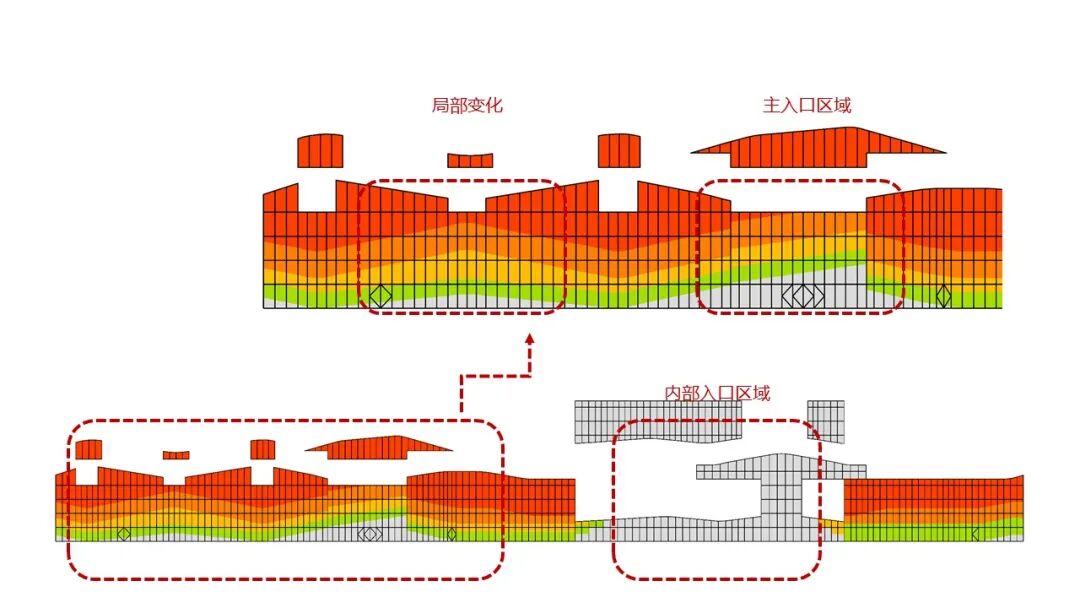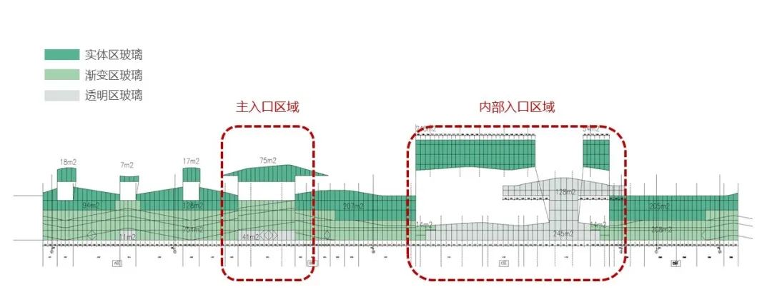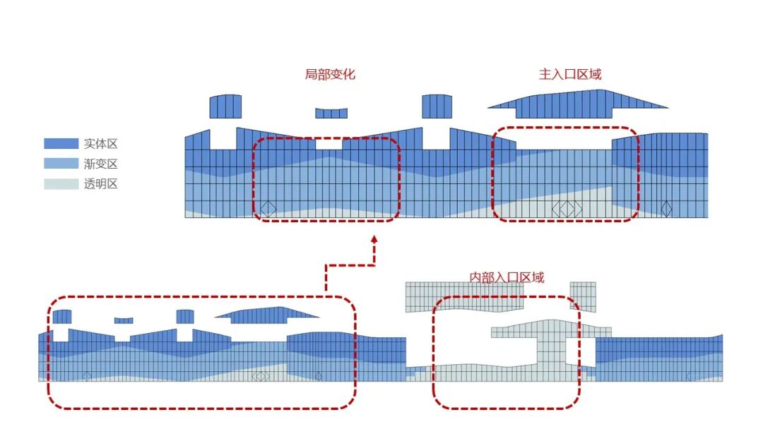 虚实节奏依据建筑空间及造型关系变化。渐变区高低与幕墙高度多为镜像关系,入口区整体相对通透,内部空间需遮挡处理的地方局部扩大渐变范围。同时对幕墙进行覆盖率的核算,满足保温遮阳等的技术需求。