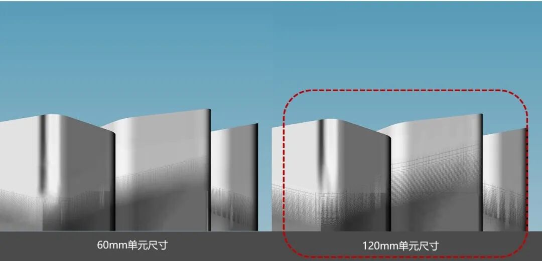 近景尺度的另一个层次是对图案密度的控制。在1.2m左右的幕墙划分宽度尺寸下,较小的单元图案会呈现出较为致密的渐变效果。单元尺度放大时,则整体呈现舒展的渐变感。方案优化后,我们最终放弃了60mm的单元尺寸而选择以 120mm为基础彩釉图案单元实行图案设计。