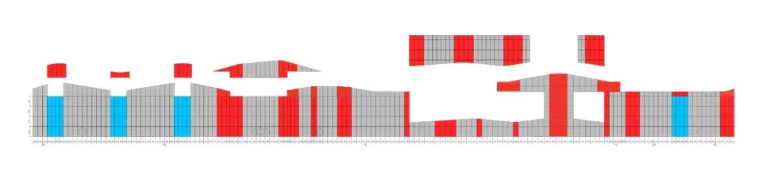 而在纯条形的片区,我们依旧按照初始方针,将纵向分缝隐藏在图案分缝里,消隐幕墙分缝。