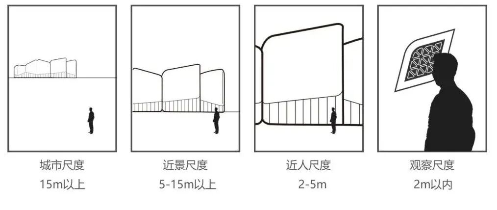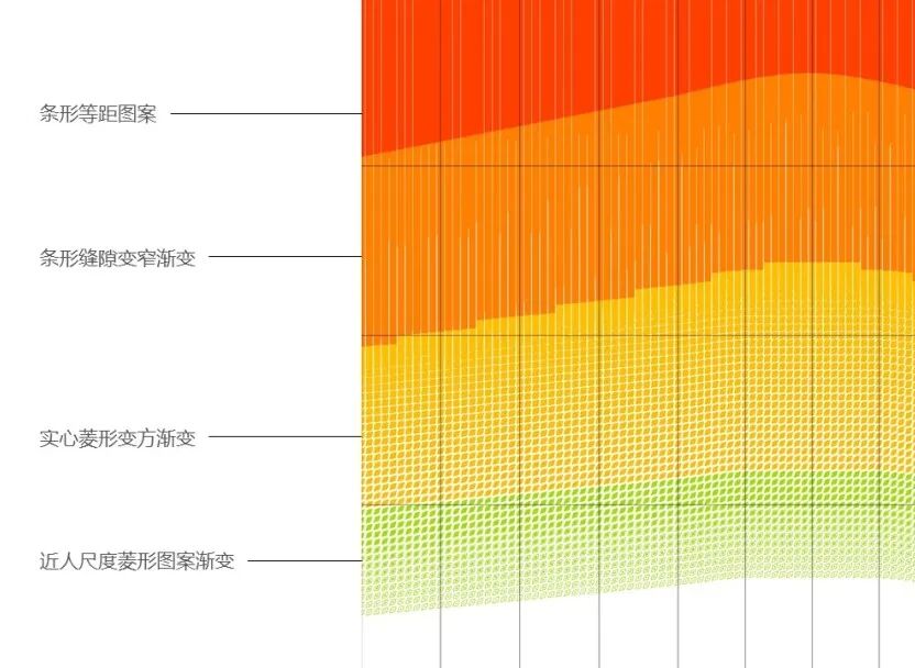 近景尺度针对幕墙渐变层次进行了细化分区。依次形成:菱形图案由虚变实——实心菱形变方——条形缝隙变窄——等距条形四个层次,同时反复比较和确认各层渐变高度及渐变图案数量,以保证近人尺度的匀质渐变效果。