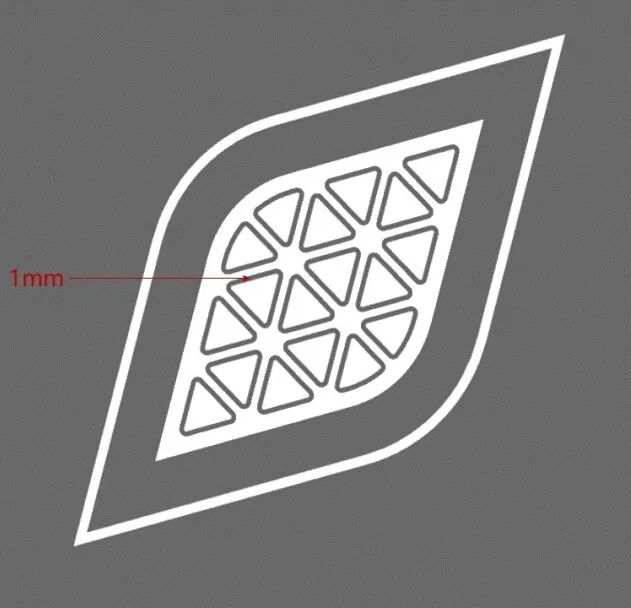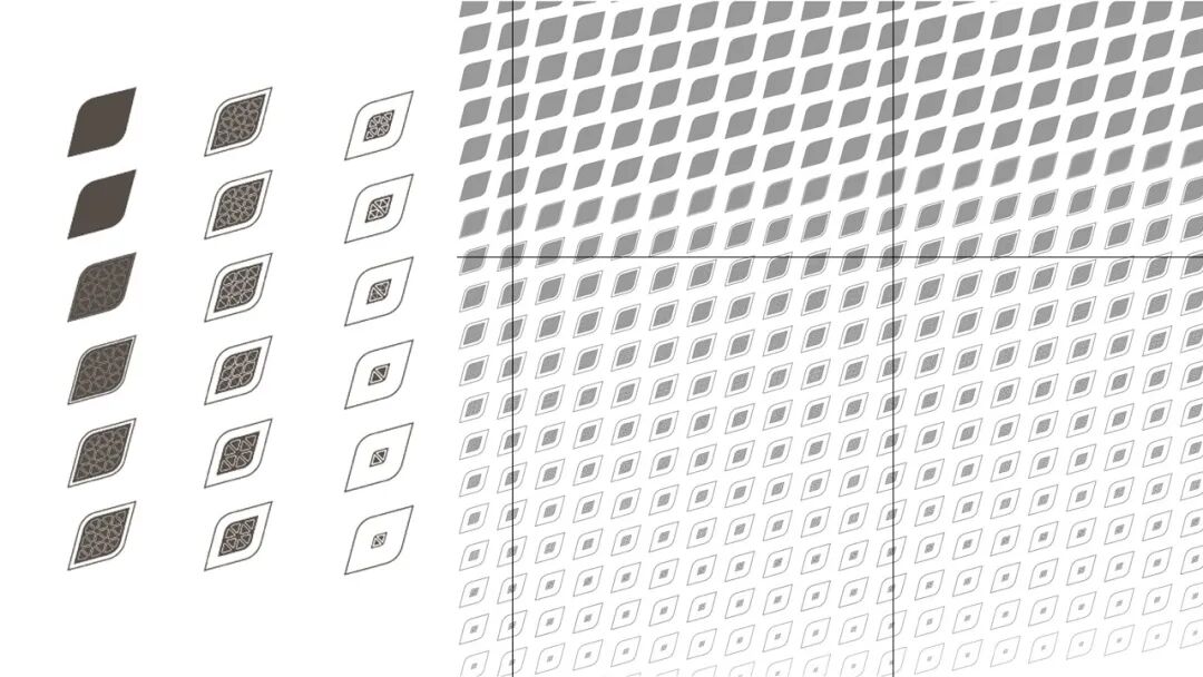 当对单个图案再一步进行放大观察时,能看到菱形图案上精致细小的细节。此层级的设计涉及图案精度的考量,通过与彩釉打印厂家的协调沟通,我们最后将图案精度极限设置成打印所能实现的最细尺寸(1mm)。在保证效果可实现的基础上,将单一菱形单元进一步分化成多层次的菱形阵列渐变,同时对渐变处进行交接设计处理,保证观察尺度下图形变化的匀质性。