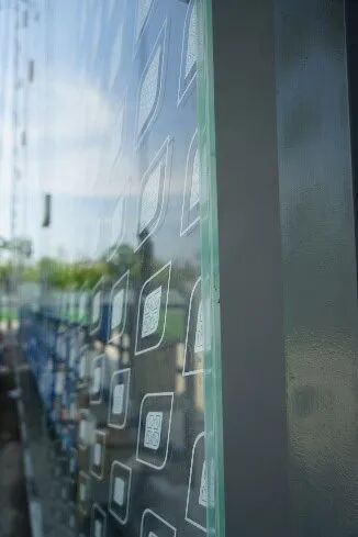 彩釉打印过程中还需要考虑的是色差问题。在设计之初出于对造价的考虑,希望在平板玻璃上采用丝网印刷,在曲面玻璃上运用数码打印。但不同的打印方式在不同玻璃上会造成很大的色差,哪怕同为白色。最后我们还是从大效果考虑,统一用数码打印的方式来保证整体彩釉打印料质一致,胶片一致,工艺相同,以此尽可能减少图案在不同玻璃上的色差。虽然最后还是会因为玻璃不同有微小色差,但已是很难辨识了。