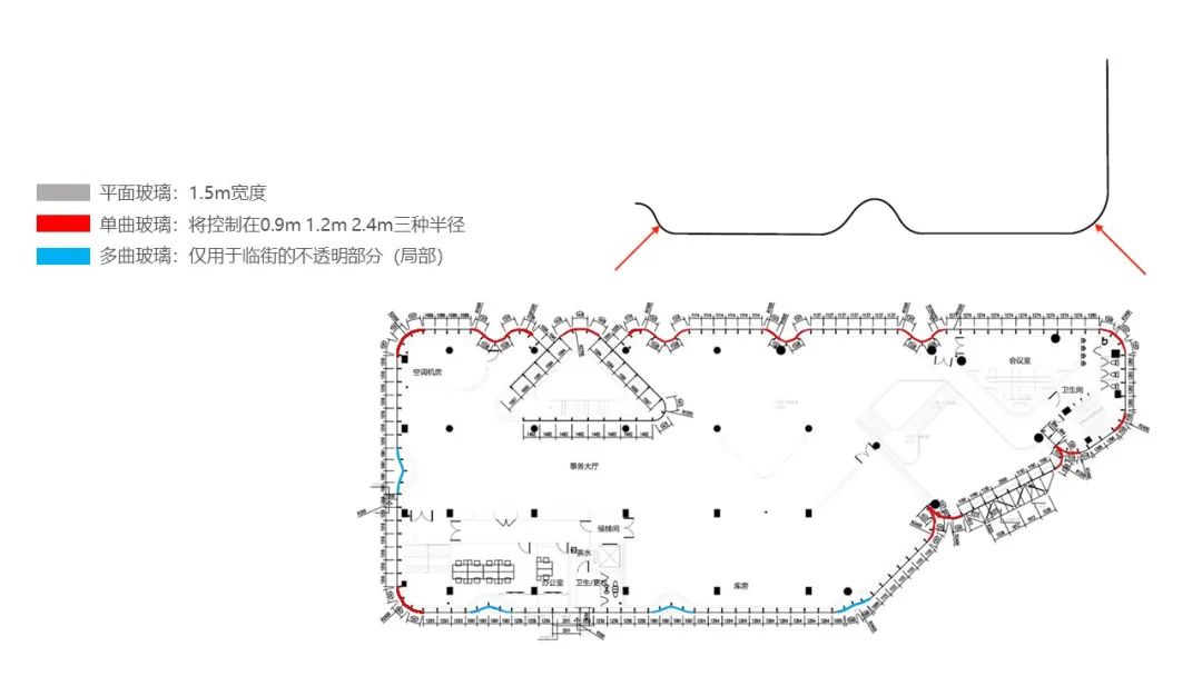 对于昆虫博物馆异形幕墙的形态,我们希望在保持理想造型效果的基础上,将曲面异形玻璃的数目控制在有限范围之内。优化设计过程中,整体建筑仍以平面玻璃为主,仅在建筑形体转弯处以及背街侧立面通过3种半径的单曲玻璃形成整体建筑的流畅造型。在临街的主展示面上,则局部少量运用多曲玻璃,实现造型灵动性,达成效果和成本的双料控制。