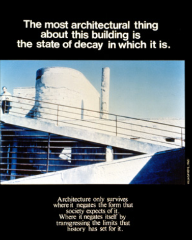 建筑只有在它否定社会对它的期望形式的地方才能生存,它通过超越历史为它设定的界限来否定自己。