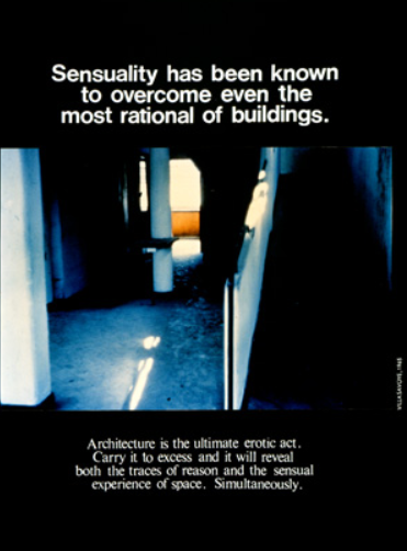 屈米一些早期的理论文本用“建筑广告”的形式来说明,这是一系列由文字和图像组成的明信片大小的宣传单,每一个都是某种宣言,直面空间经验的直接性与理论概念的分析定义之间的分离。