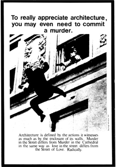 例如,屈米曾将建筑广告描述为:“这些广告中带有某种讽刺意味的图像都是在文章的背景下准备的,无法以常规方式进行说明。毕竟图纸和照片只是纸上的空间,没有办法在画廊或杂志上‘表演’建筑,唯一的办法就是让人相信。所以,就像所有其他建筑产品或香烟和威士忌的广告一样,这些广告只是为了激发欲望。”