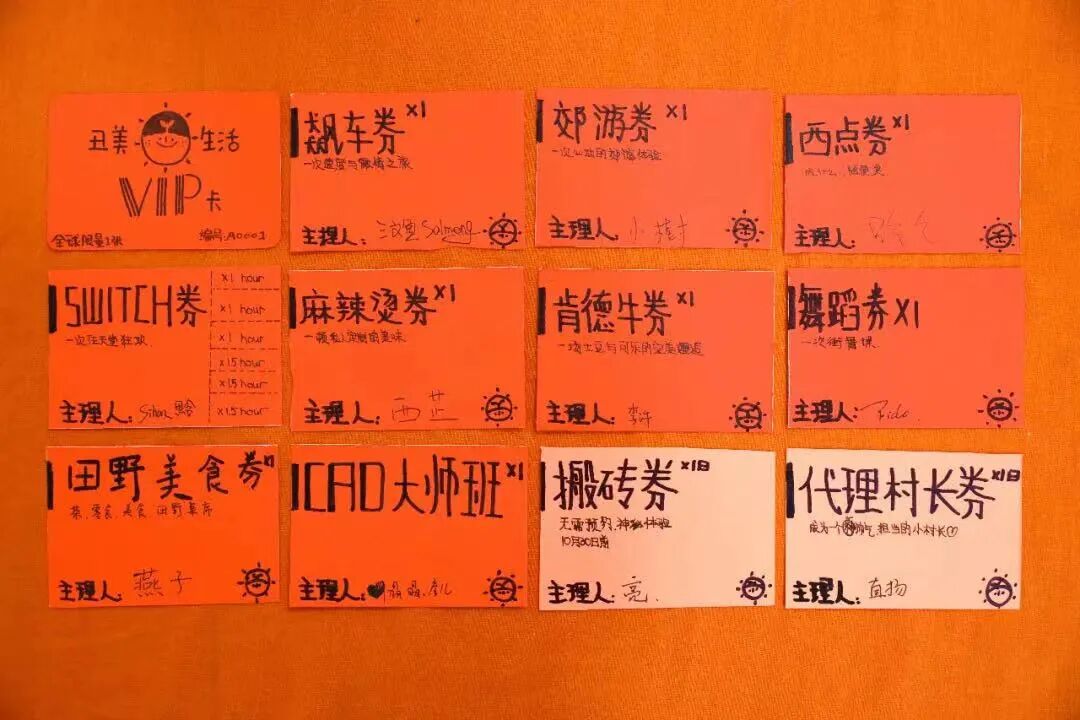 社区的伙伴给施国平儿子准备的生日礼物:各项技能体验券,包括当一天代理村长