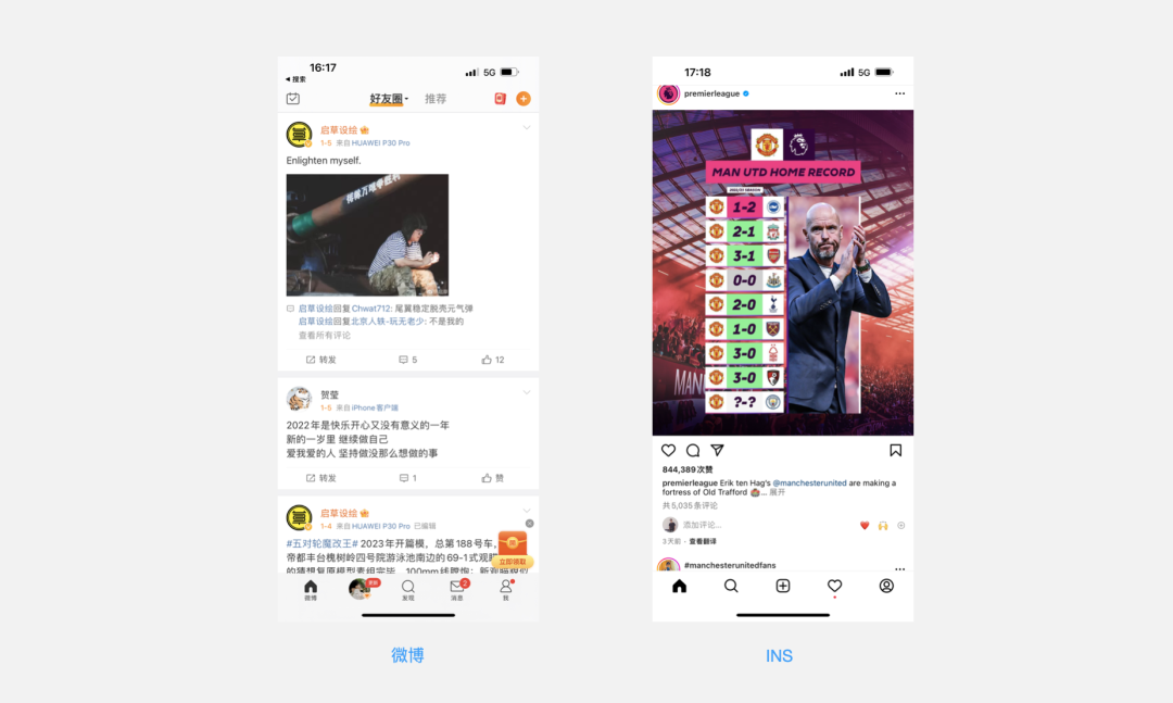 看到这,可能有同学有疑问了,Instagram也是这样干的啊,微博不就是“深度借鉴”的ins吗?苦笑一声,随手截两个首页,大家看看这两个产品是一样的吗?