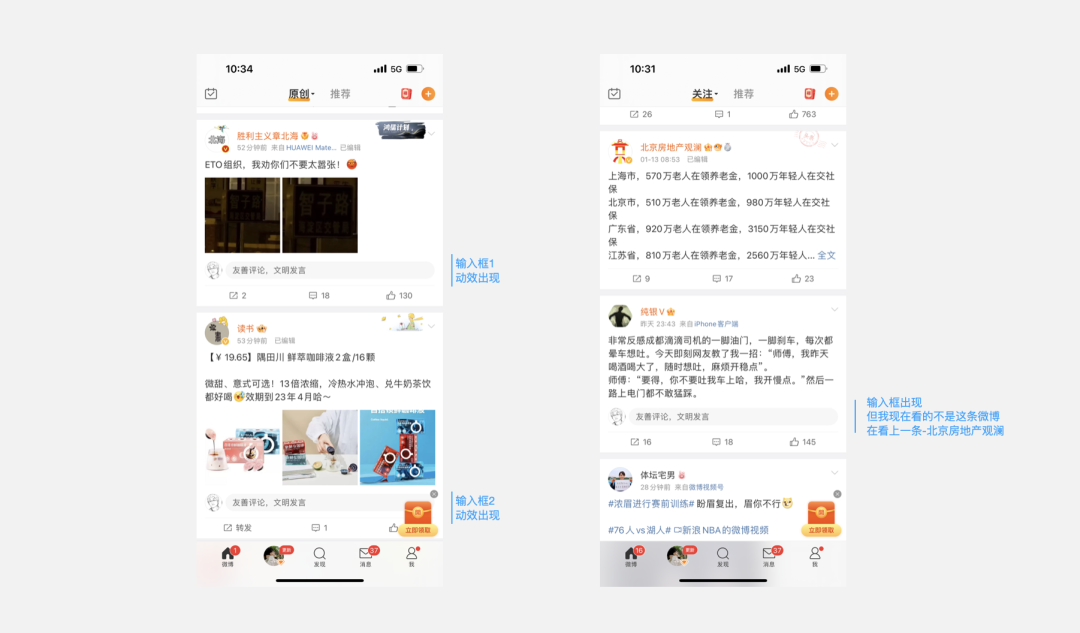 以「新浪微博」为例,用户在某条微博上停留一定的的时间后,系统会判断用户对该内容有兴趣,从而弹出‘评论框’,进而引导用户进行评论。看似有道理,结果却是整屏经常会有2-3个评论框接连出现的情况,非常干扰用户正常阅读。