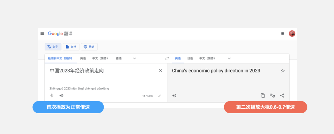 网页版的Google翻译里,用户在第二次点击发音按钮时,读音播放的速度会明显比第一次缓慢。