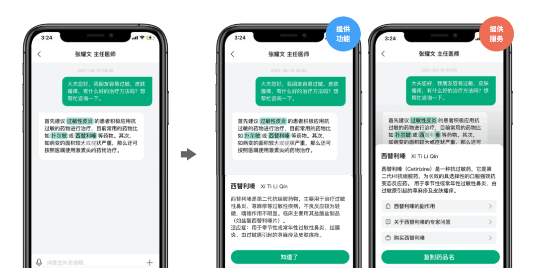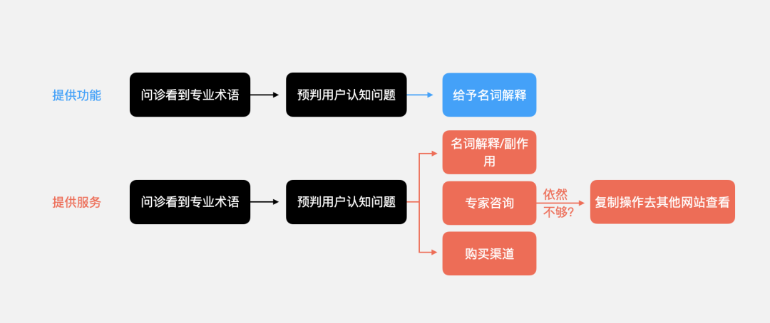 落实到设计上,最右侧方案不仅提供名词解释,用药禁忌,专家咨询,甚至提供了购药渠道,相较之下,实现了对需求的深度挖掘,体现服务的闭环。