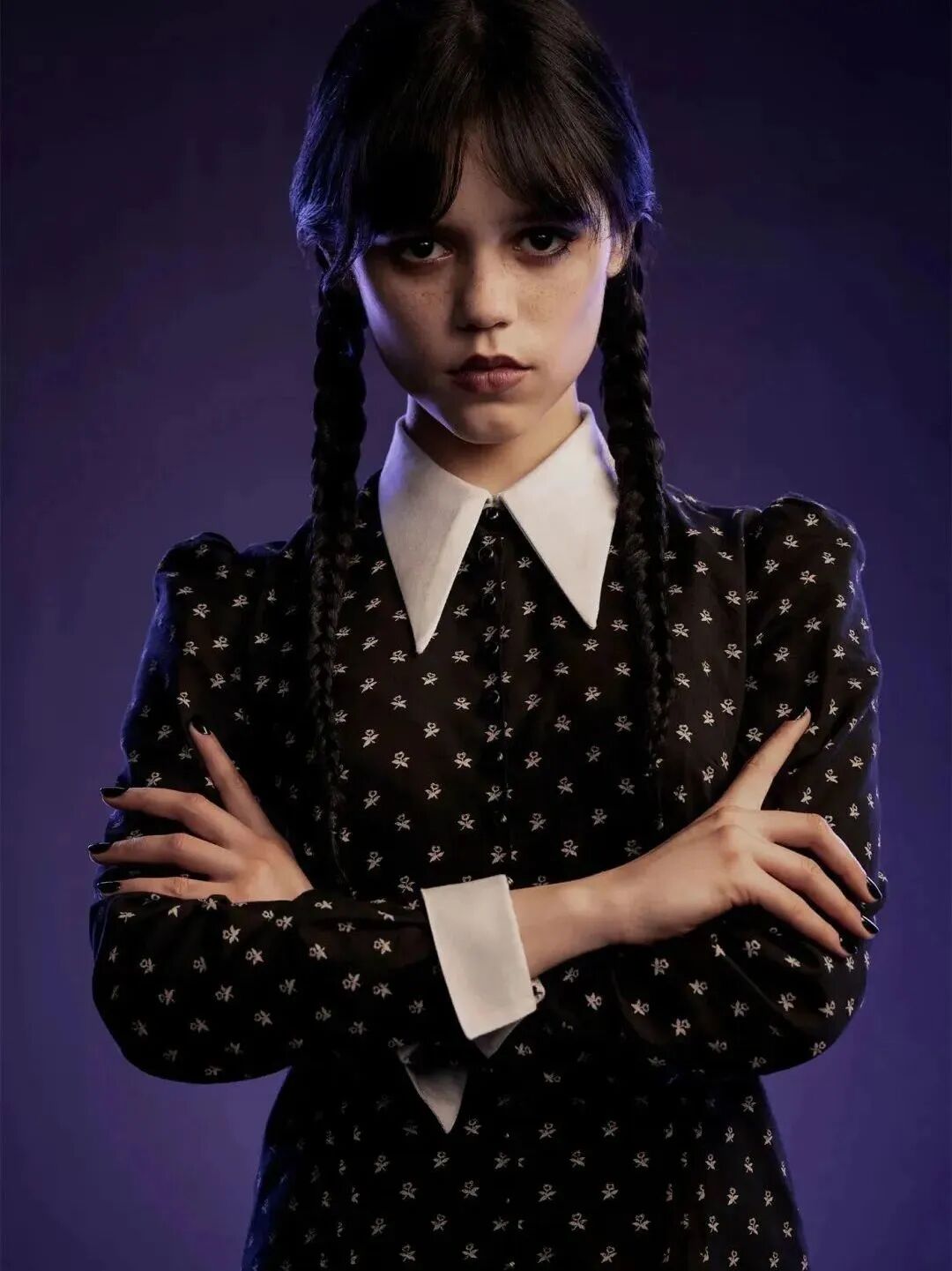 其实,早在原著漫画《亚当斯一家》1938年登场时,Wednesday双马尾辫子加白色翻领黑洋装的造型,就让人印象深刻。