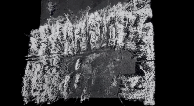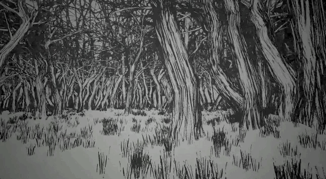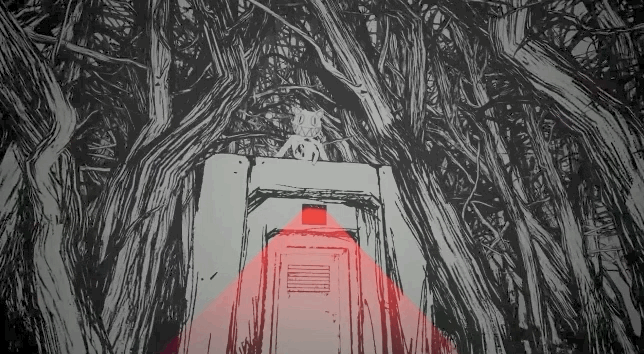 体验从一片荒凉的黑白森林开始。在背景噪音中潜行,有一座隐匿于森林深处的长条型建筑。被红色光线照亮的地方,便是展览的入口。
