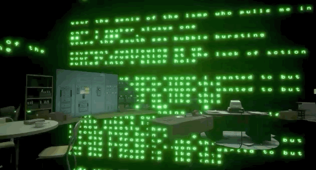 每个房间都提供不同的视听体验。像这个被绿色矩阵包围的房间无疑会让人想起《黑客帝国》。房间摆布一些寻常的办公用具。