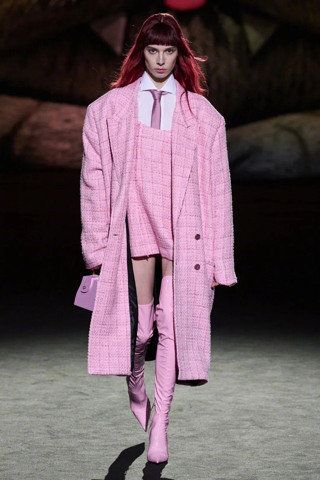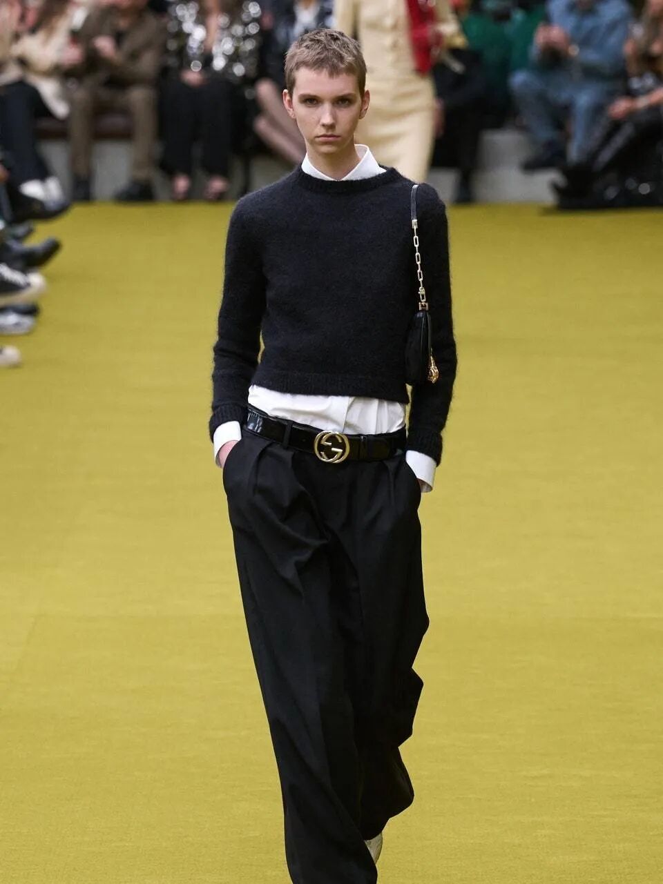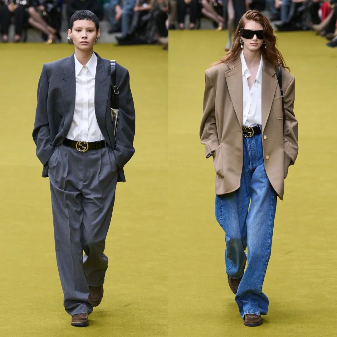 因为是一部纪录影片,所以GUCCI品牌服饰历史中那些标志性里程碑式的元素,例如廓形外套、拖地牛仔长裤等,都被搬到了舞台上。