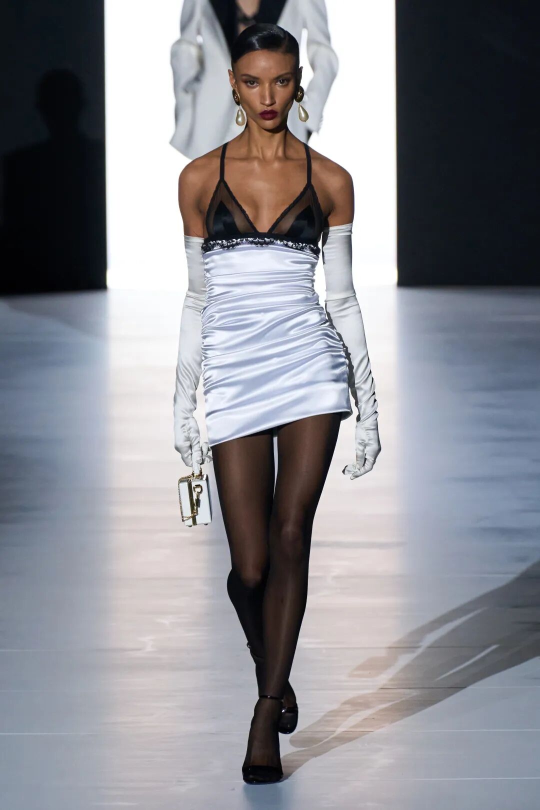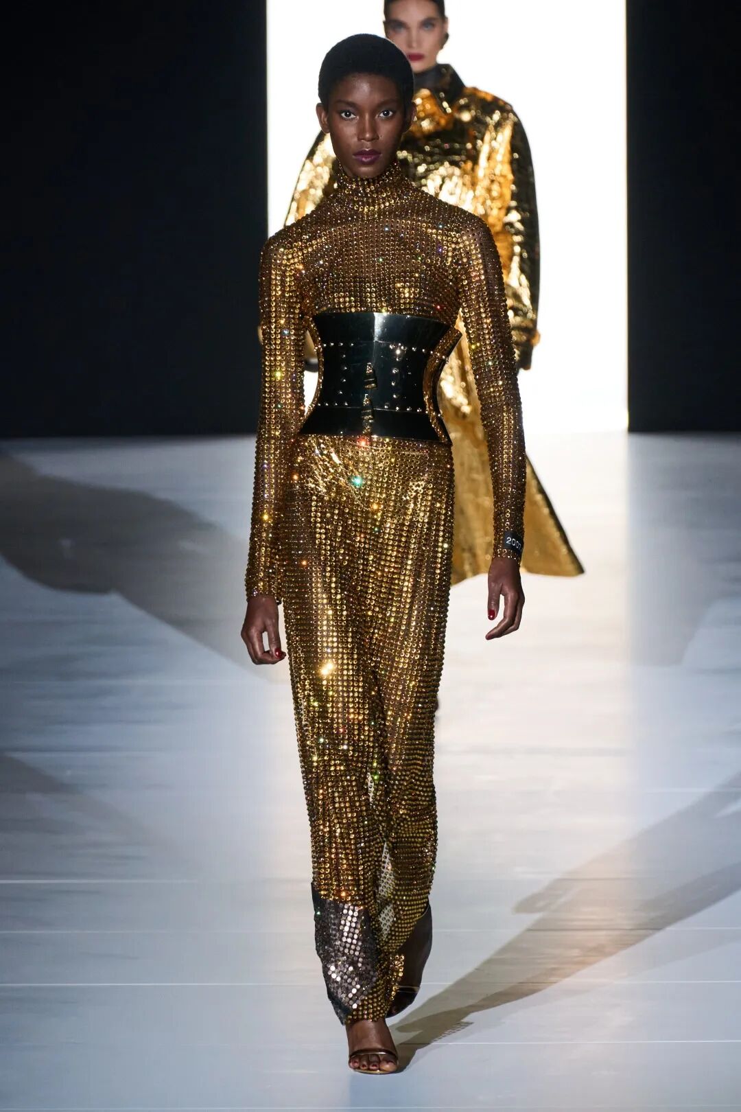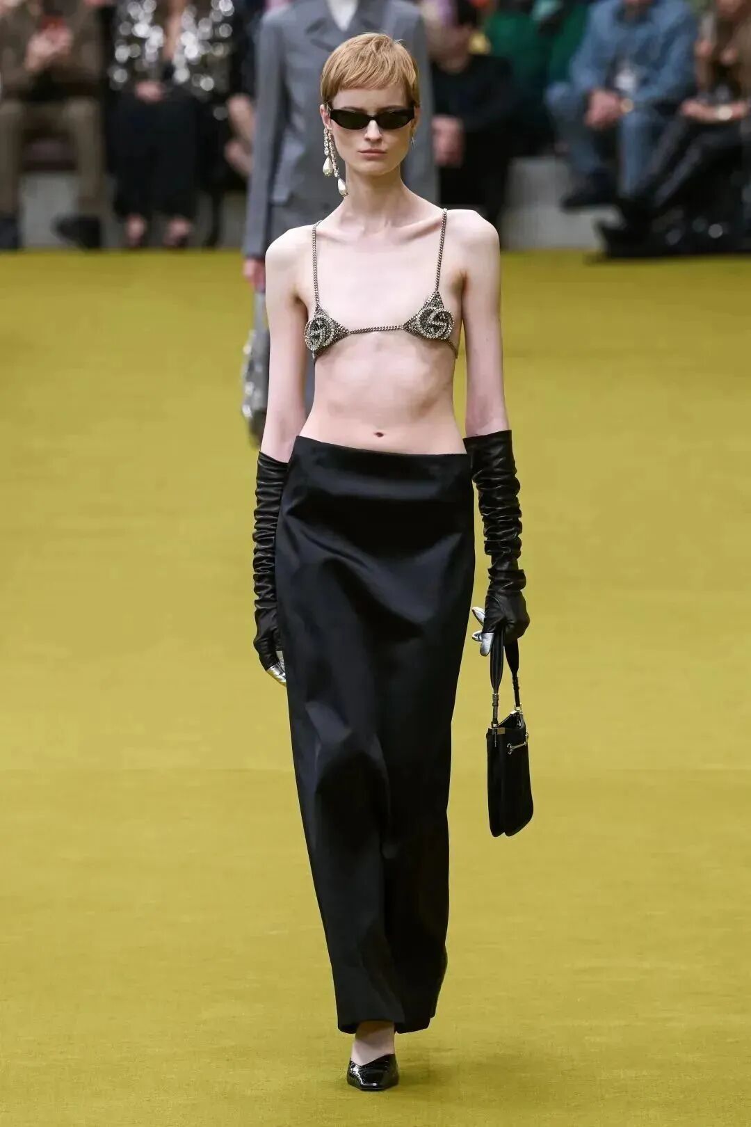 开场的首套造型就很惊艳,双G金属的文胸搭配一条黑色长裙,把珠宝变为服饰,十分性感。
