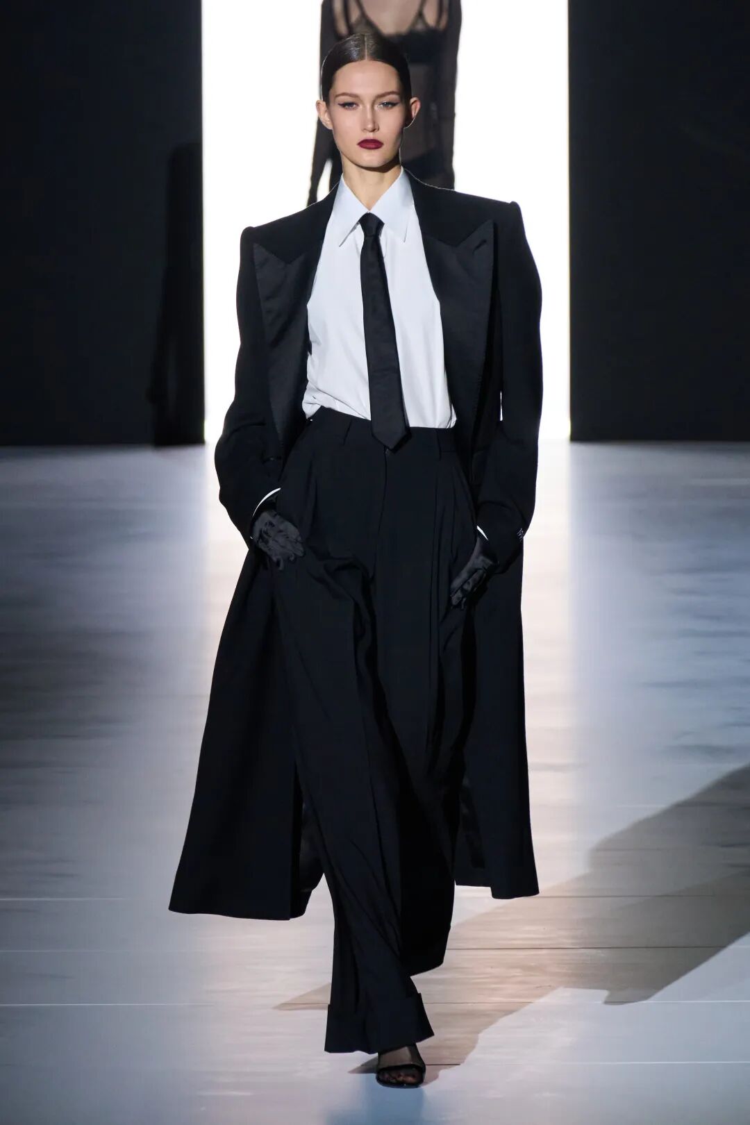 这些柔中带刚的女性一出场,便是华丽又梦幻的。形似玫瑰花窗的起点十分耀眼,巨大的光束贯穿整个T台,洒在地面上,浪漫氛围油然而生。