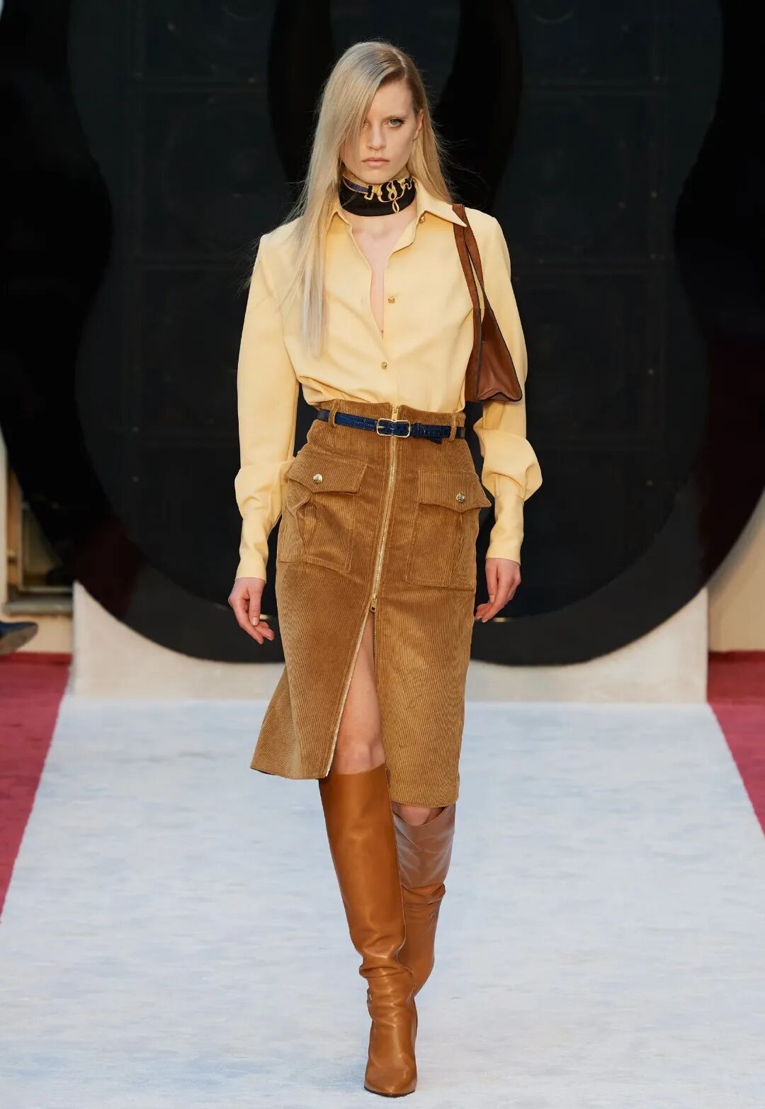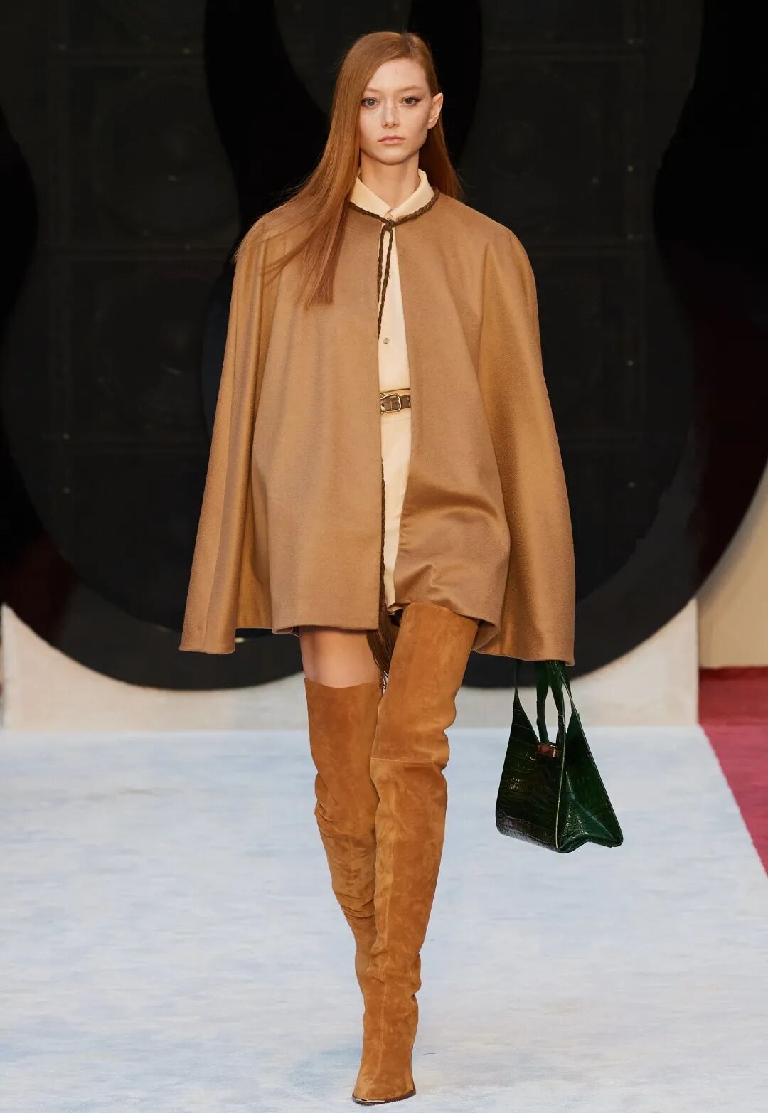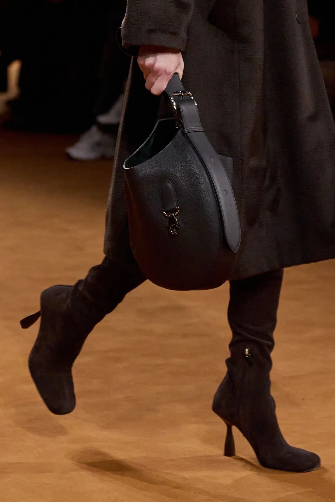 方头过膝绒面革靴子是此次秀场上的亮点。锥形的马蹄钉鞋跟上脚舒适度会比高跟鞋好很多,更加实用。