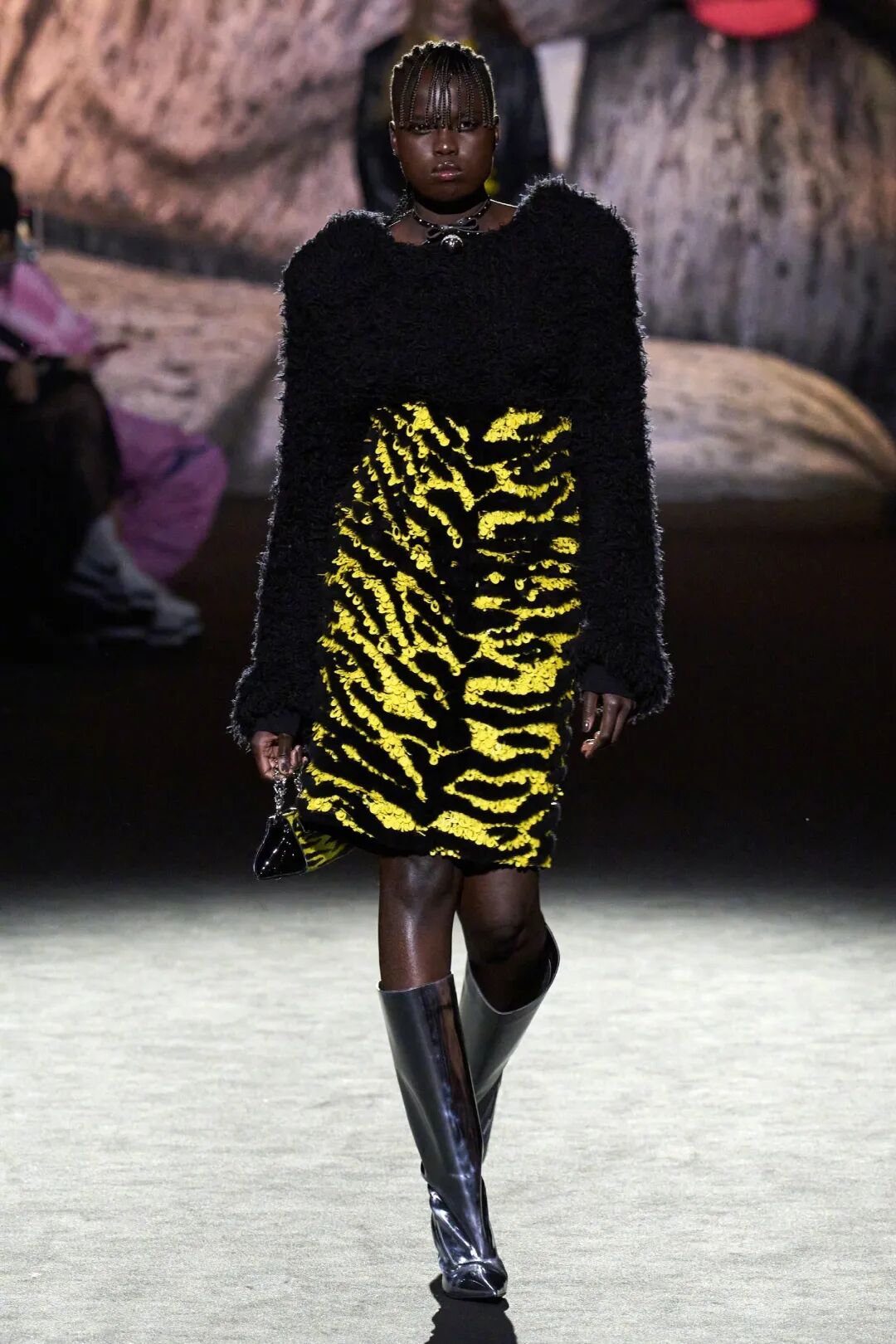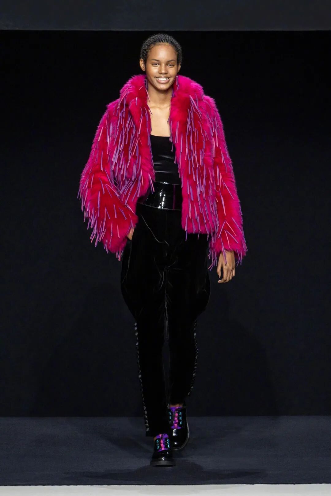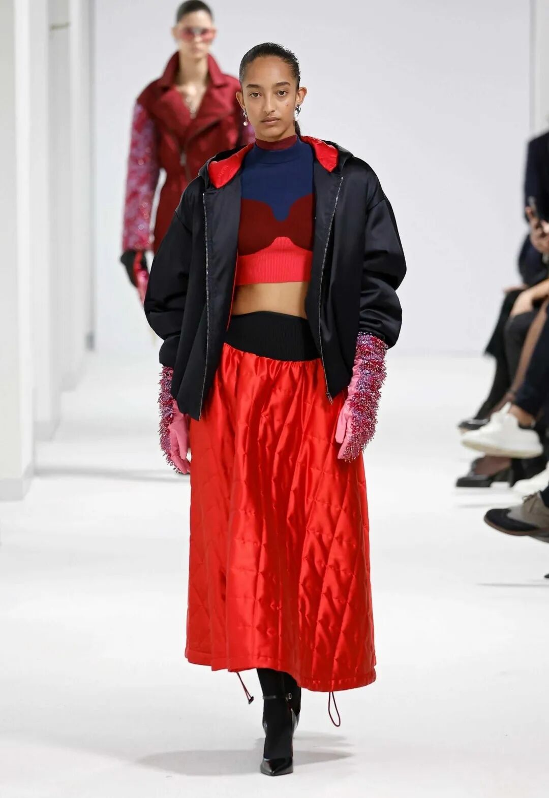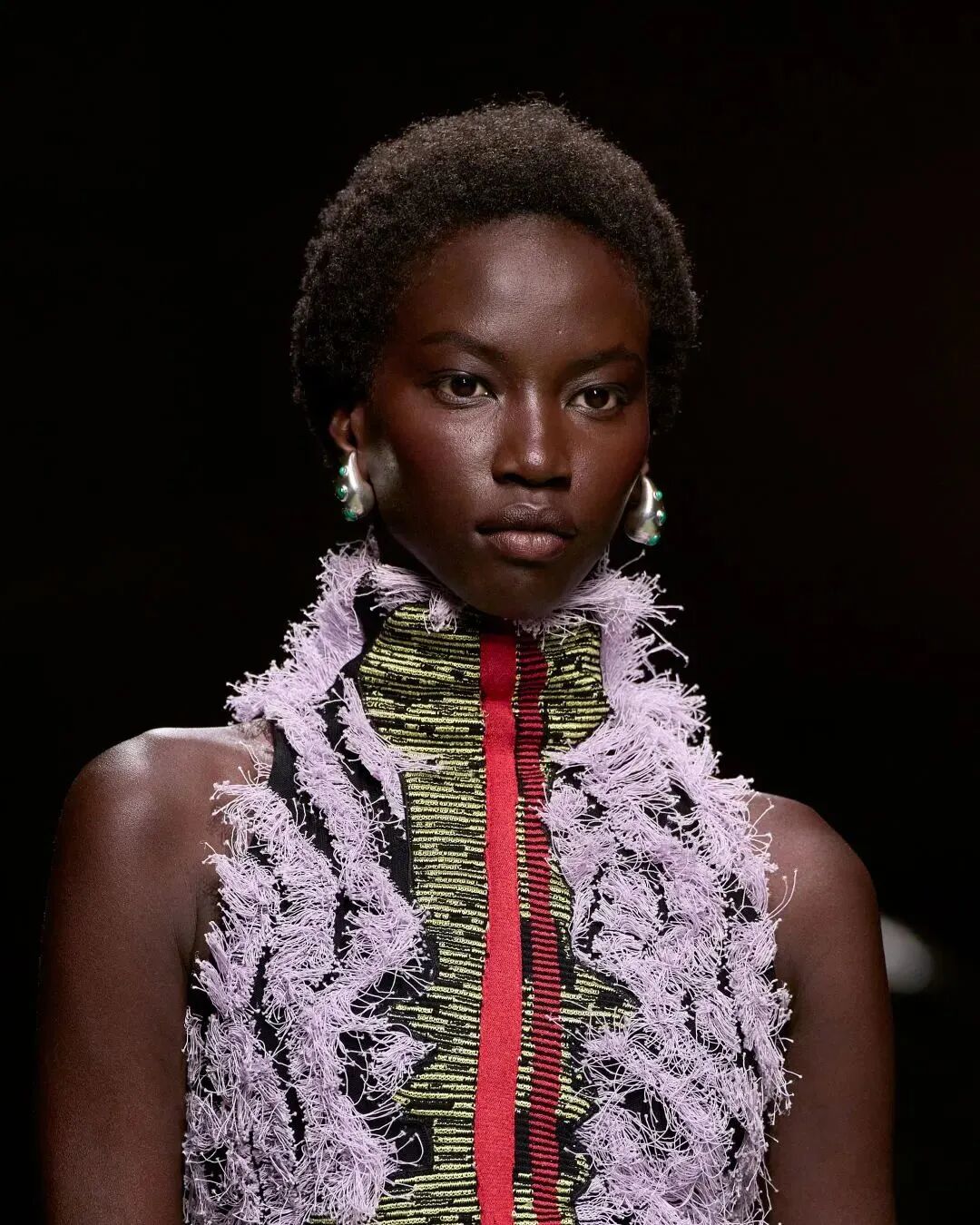 在看秀时,一开始我的注意力全都被鸡冠羽毛头给吸引走了,但是越往后我却发现了很多小细节,比如这套成衣的肩缝和裙边处都有尖刺,透露出叛逆、与众不同之感,有点让人“毛骨悚然”。