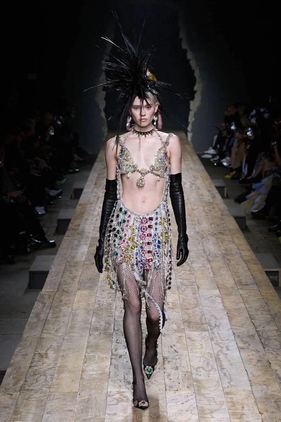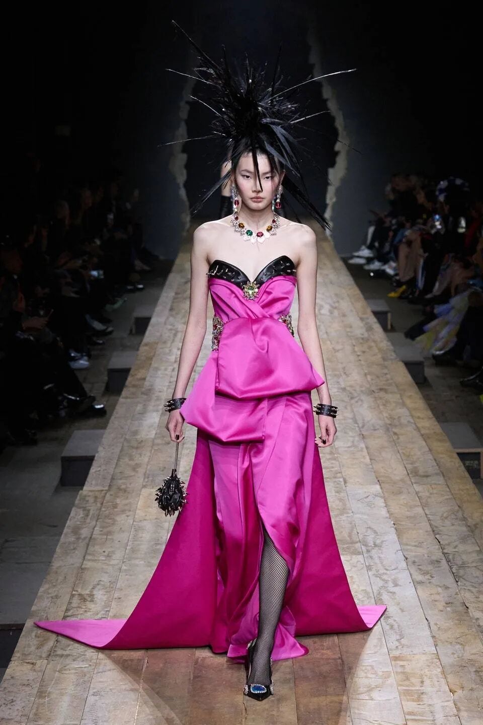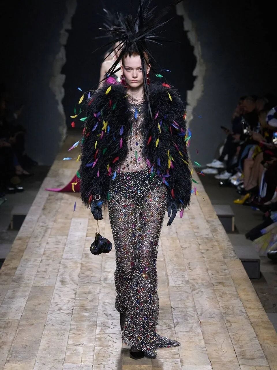 MOSCHINO的秋装女装秀场,与其说是一场秀,更像是一场是时装戏剧,鸡冠羽毛头真的好吸睛!
