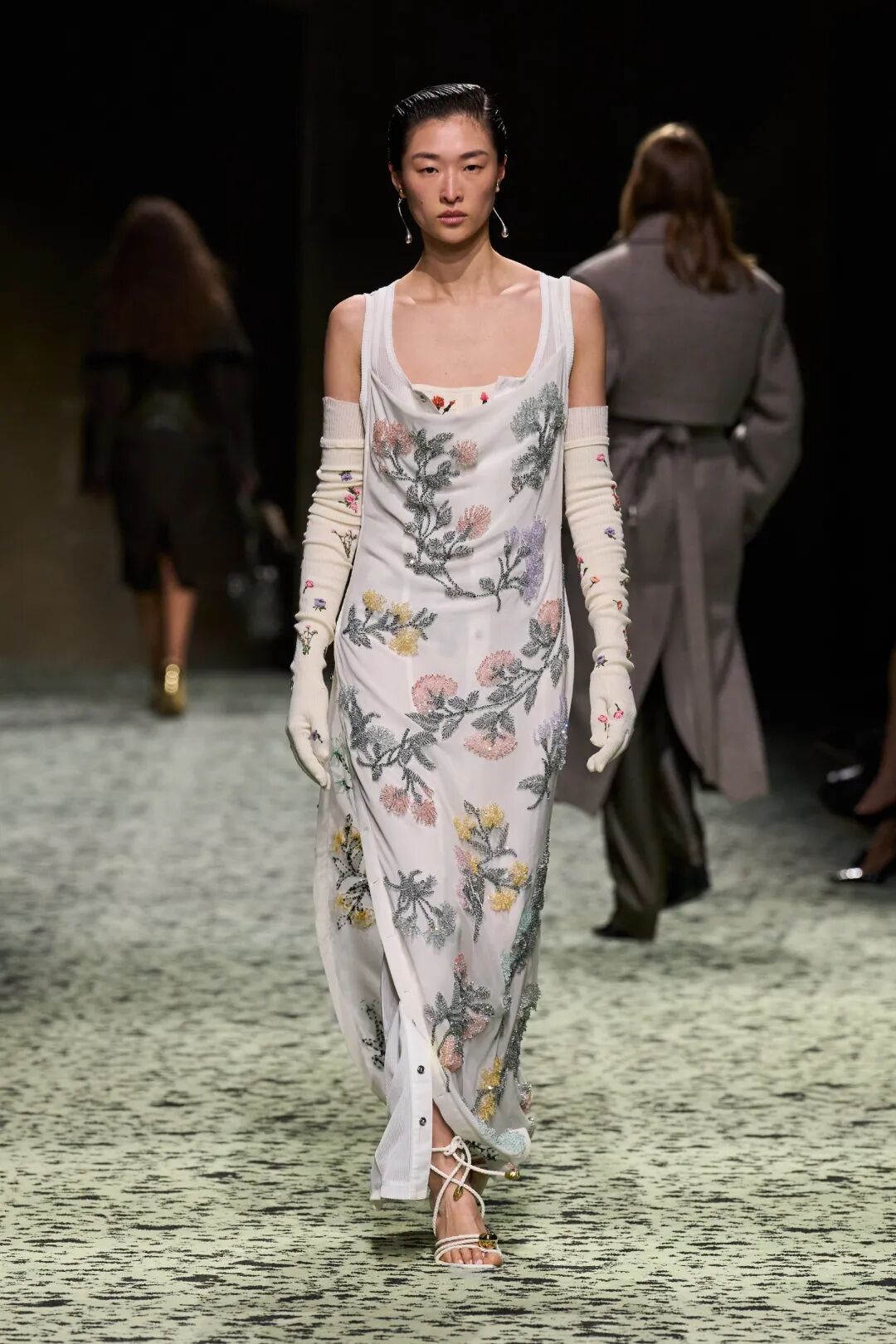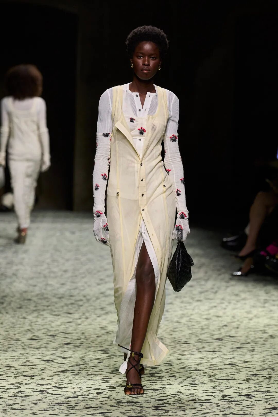这次BV秀场的元素多到眼花缭乱,流苏、雪纺、刺绣、镂空、鳞片,借助不同的组合,被呈现在秀场上,既具有浪漫主义,又符合现代审美,即传承了意大利传统工艺,又发挥了Bottega超高的审美态度和皮质核心,即炫技又时髦。