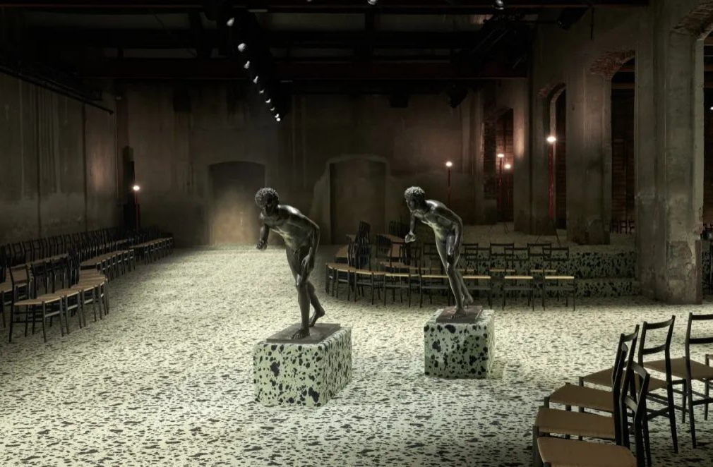 先来说说秀场布置,充满意大利风情的波丘尼雕像和罗马青铜跑者,是从博物馆里借来的无价之宝,这种氛围的营造,很用心了!