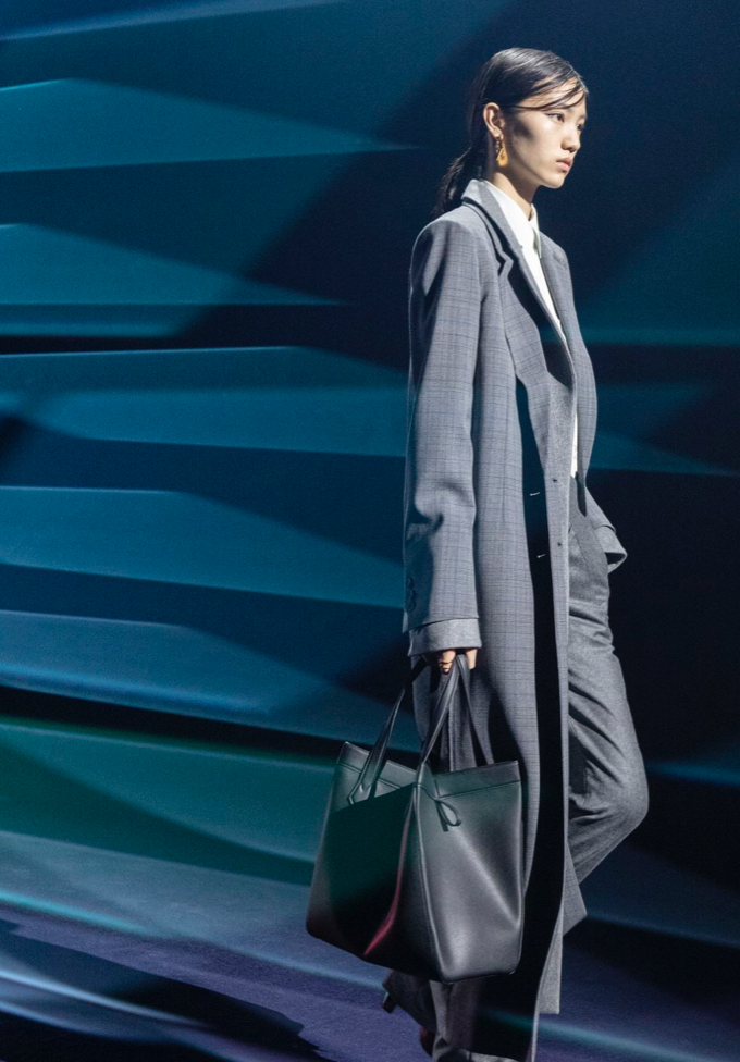 色彩,是体现刚柔并济最好的手法。Kim Jones曾说,我至今还记得上班第一天的Delfina(Fendi 第 4 代传人、品牌珠宝创意总监)身穿蓝色与棕色套装在办公室里优雅的姿态,给我留下深刻印象。所以,本季的服饰中可以看见很多棕色、蓝色、红色、紫色等个性亮眼的颜色,营造了别致优雅的格调。