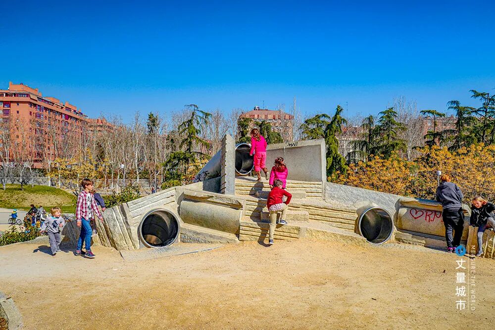 马德里河岸公园不仅有儿童的游乐设施,年轻人的极限运动场所,也有老人的锻炼场所,成为集健身、休闲、运动、交往等功能于一体的综合社会项目。