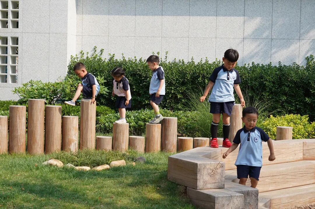小朋友眼中的世界,和成年人有很大不同。3-6岁的小朋友们,尤其乐衷于用身体探索周围的世界。在幼儿园的自然庭院,以小朋友的视角出发,设计了能提供多样不同体会的游乐设施,鼓励小朋友进行探索。小朋友会排队登上塔楼,探头去寻找在水泥管中匍匐躲藏的同伴,平衡木上进行相互角力,看看谁可以坚持到最后。夏天的时候,可以在旱溪中玩水,有的小朋友按压水泵,也有小朋友光着脚丫到旱溪里,把同伴刚刚泵出的水流踩出水花。在这些集体玩耍中,大家会彼此互动、交流,从游戏中自然的学习社会性的规则。