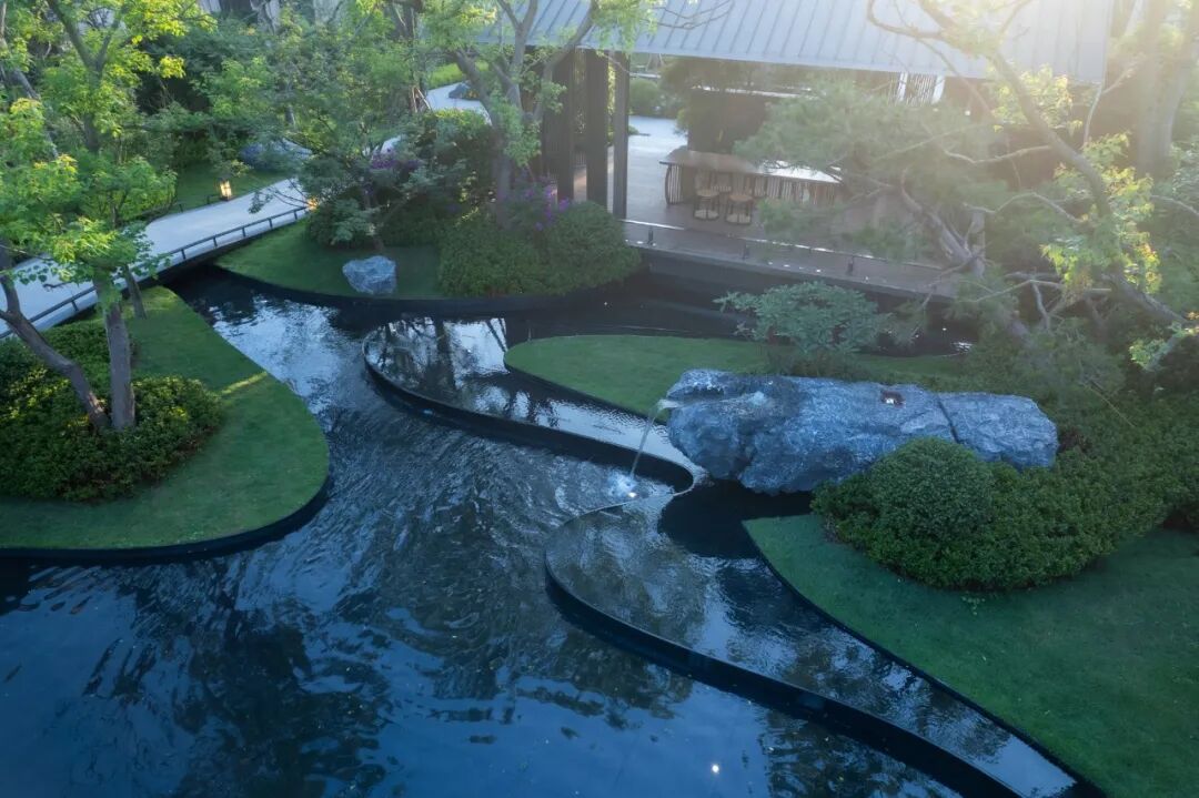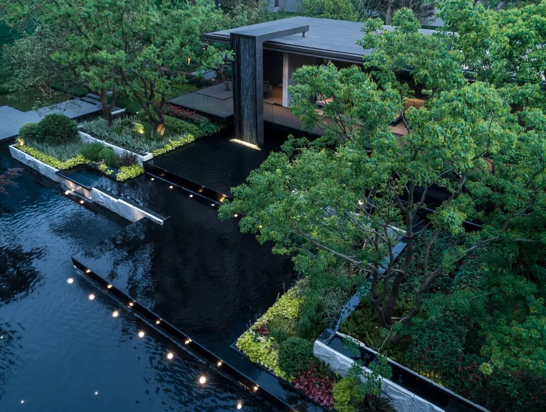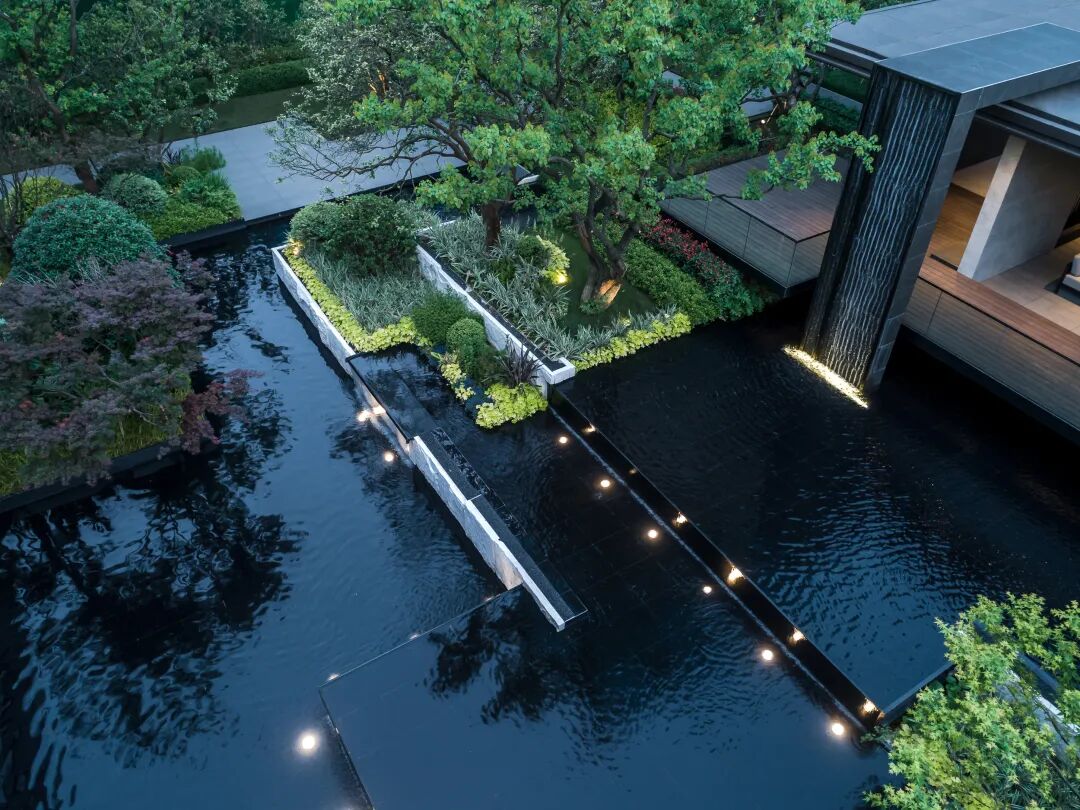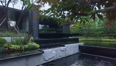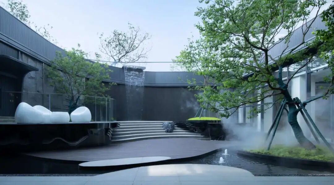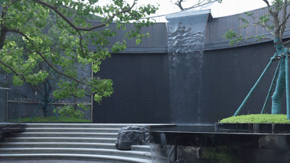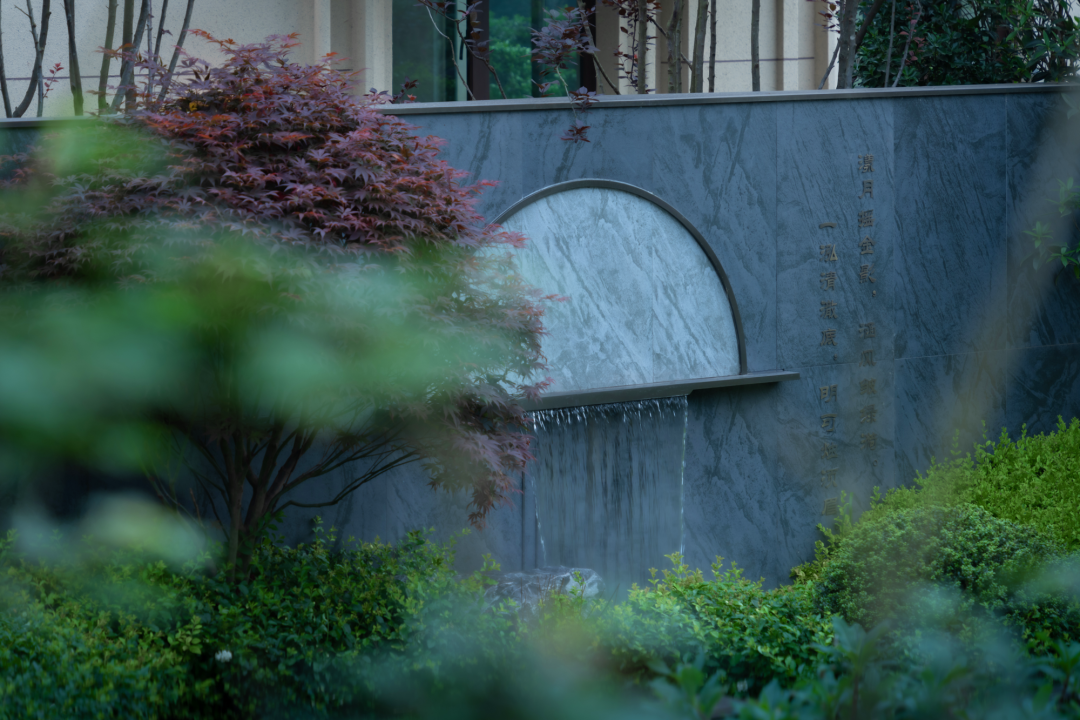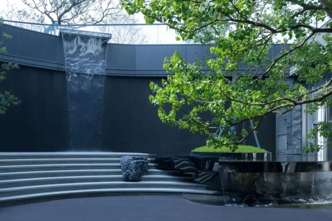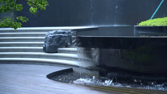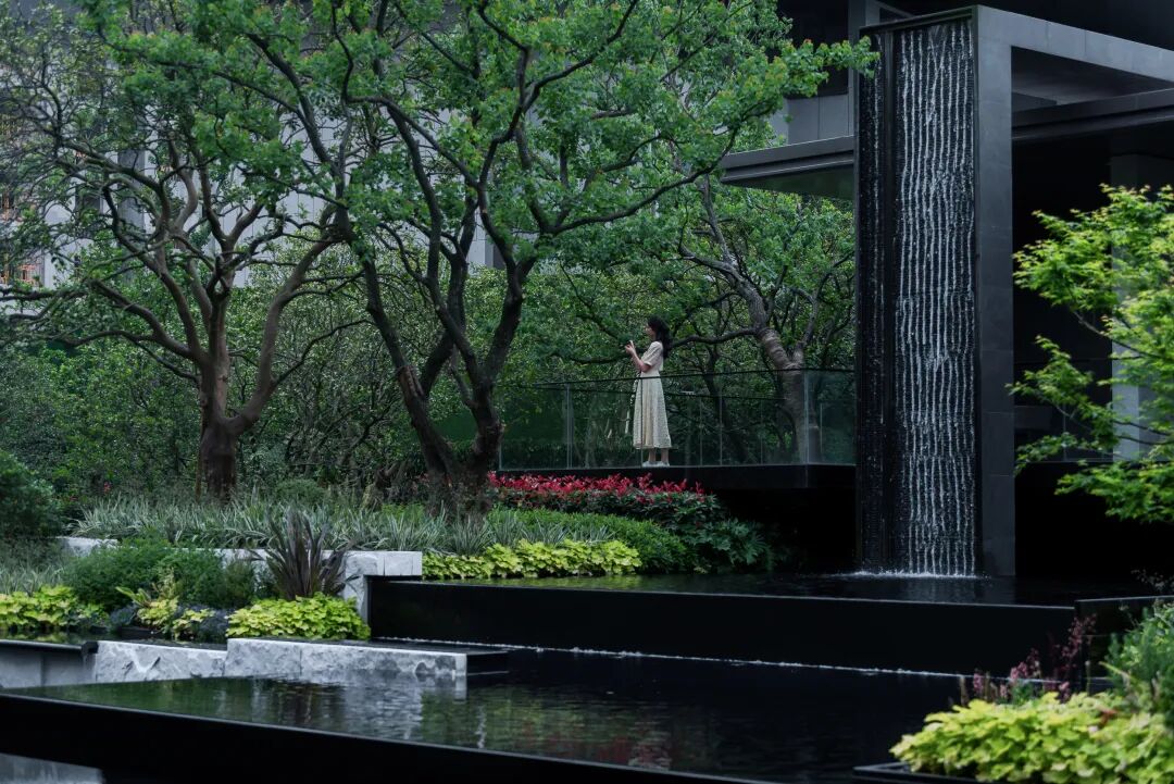 以跌水声模拟淅淅沥沥的雨夜,以声为院子带来静谧氛围,植物掩映之下,使内心归于平静。
