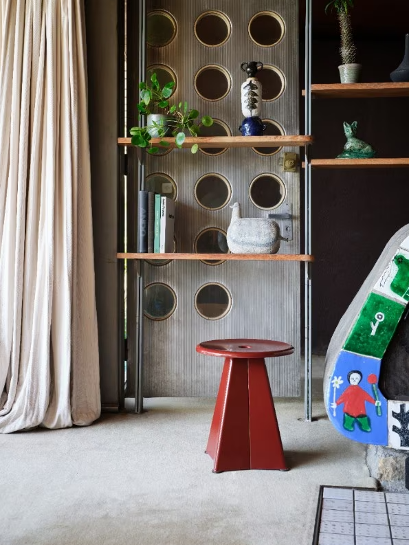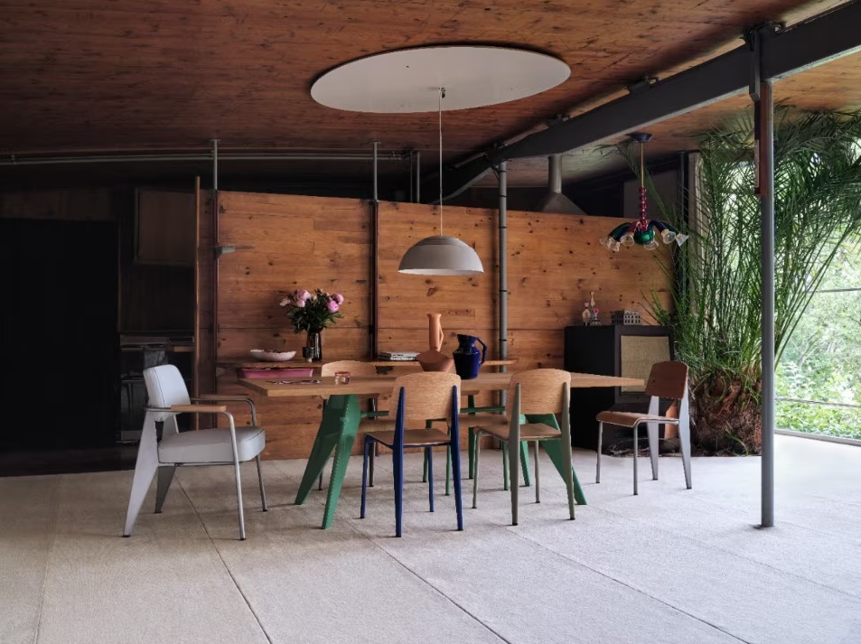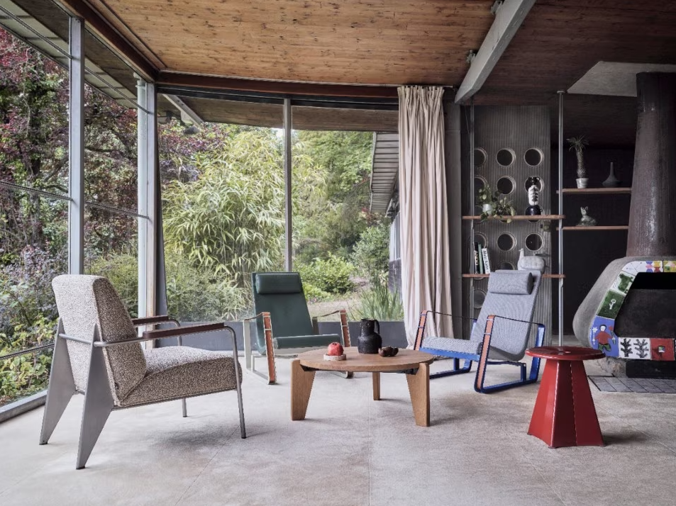 另一个标志性的作品是EM桌子(1950年),它基于必要的工程美学交叉连接对角腿,从而强调结构的静态关系。这款家具是Maisons Tropicales (1949-1951) 项目的一部分,这些低成本、可拆卸的项目中只有三座是由木板、铝和钢制成的,用来安置西非殖民地的法国官僚。第一个模型在刚果共和国的布拉柴维尔建造,它有一个用于自然通风的双层屋顶,阳台周围有可调节的遮阳板,墙壁上的蓝色玻璃圆形舷窗可以抵御紫外线。