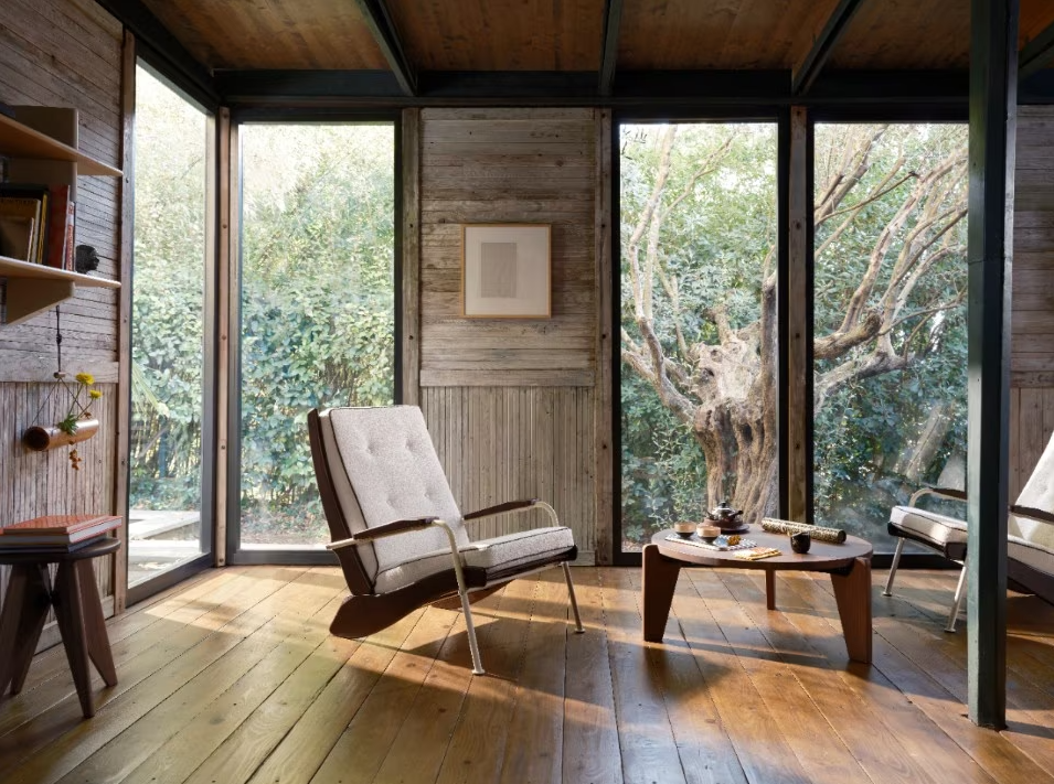 这是一个轻巧灵活的结构,是标准化元素的集合,具有遵循纯功能原则的简单线性布局。一个一米长的模块分为三个区域:私人、公共和服务。舷窗状的穿孔铝板构成了外墙和入口门的一部分,这一细节与门的角落一起载入建筑史,住宅完全基于普鲁维设计理念的四大支柱:可负担性、舒适性、功能性和耐用性,这座27米长、无地基的房屋通过组装工业元素和手工劳动完美实现了这种建筑方法。
