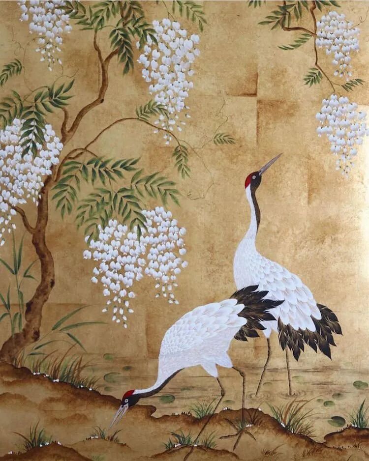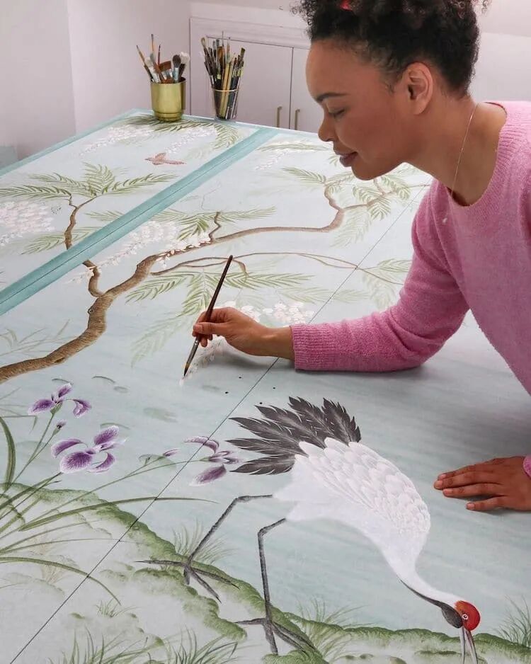 如今,“中国风”蔓延全球,从奢侈品包包上的中国刺绣,到外国时装周上的中国旗袍,如今,工笔画也被老外一整个爱上了,来自伦敦的艺术家黛安,就在丝绸纸上画出了空灵的工笔画图案,现代、清新的画风,极具美感。
