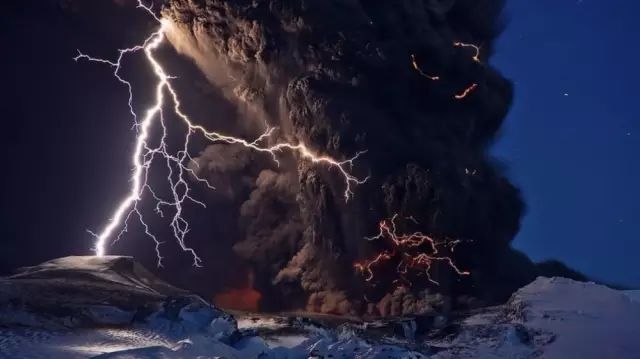 ▲雷火交加的火山喷发,冰岛