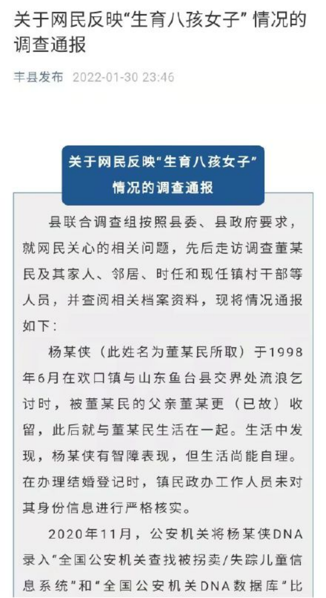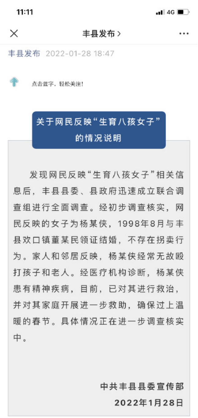 1月28日,第一次通报的初步调查结果——该女子名叫杨某侠,1998年领证结婚,不存在拐卖行为,患有精神疾病。