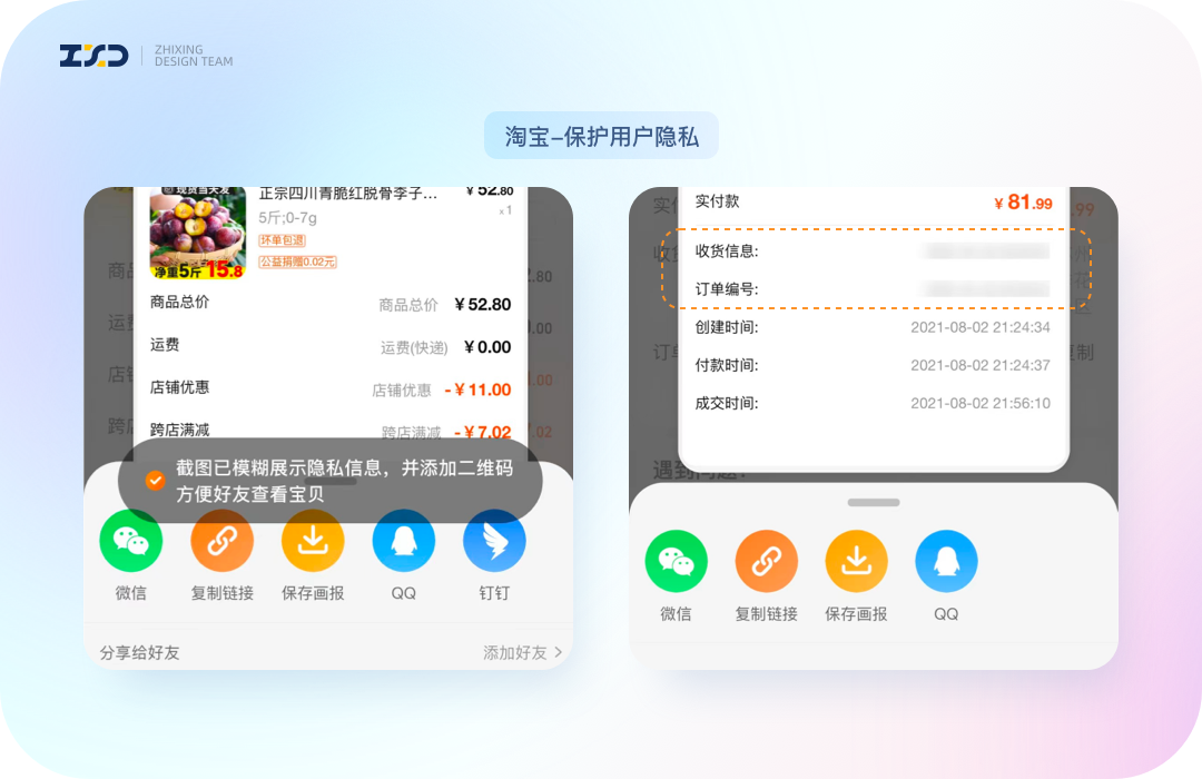在淘宝订单详情页面,使用系统的截屏功能后跳出的分享弹窗里,淘宝会自动化将隐私信息做模糊处理。能够高效且精准的定位到用户的订单编号给予隐私保护,虽然不太起眼,但在后续用户的不小心而避免了大麻烦。
