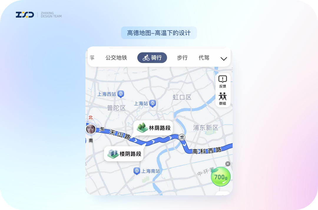 「高德地图」会利用树木与楼高的数据,配合天气太阳角度的计算,为用户提供骑行时有林荫与楼阴的清凉导航路线,这个设计可以说十分贴心了。