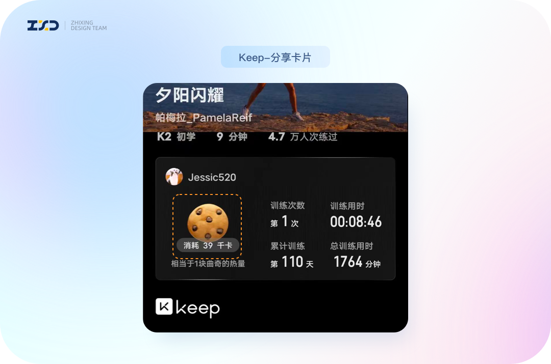keep卡片的更新,根据热量换算食物,让用户很快能Get到自己的运动量等于吃了哪种食物的热量,“相当于一块曲奇饼干的热量”阅读中秒懂。几十卡、几百卡的数字让我们有了清晰的认知,不再是冷冰冰的数字呈现,既有趣,又增加了记忆点。