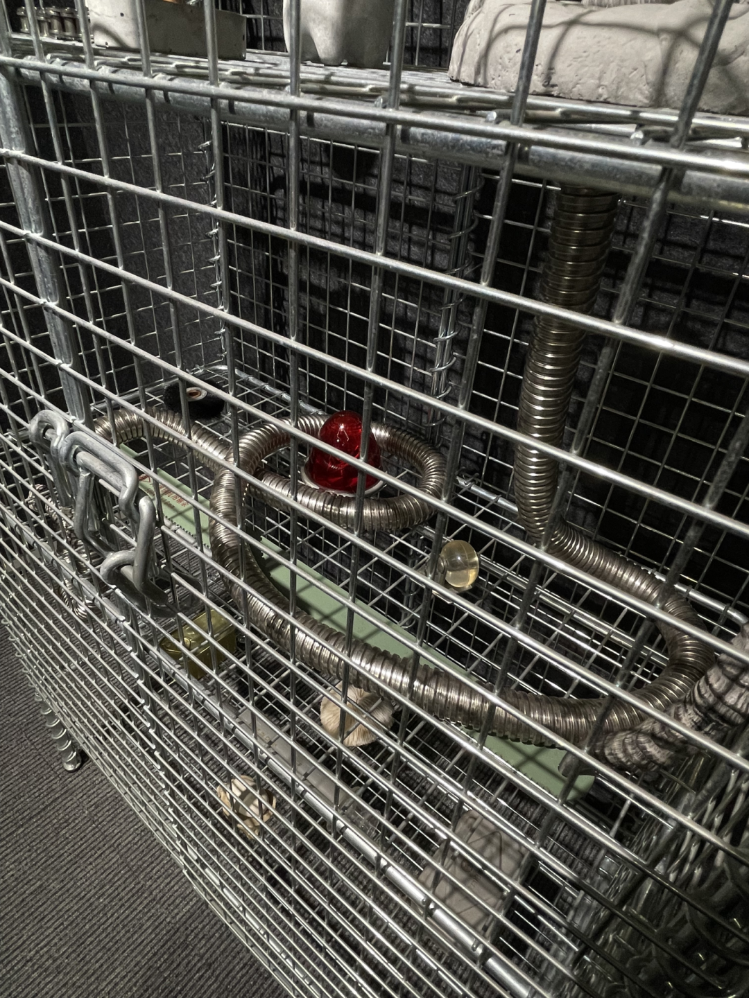 高磊在创作中始终关注工业与技术对人的规训,并使作品不断与技术的更新迭代同步,他在新天地LIVE NOW中的驻留也试图在此基础上与周围的环境发生对话:“LIVE NOW工作室的玻璃房出来车流、人流、货运与交警频繁出现的马路边,汇集了巨大的信息流与噪音。这周围有很多新能源、无人机等高新科技的商铺,而工作室也是由3D打印公司生产的,我希望在这种与我之前的工作室截然不同的环境中搜寻一些信息或物质载体去扩充我的创作词语库并进行一些探讨。”双人椅、CRT监视器,高磊构建了一个都市中的洞穴,一个孤岛,监视器上放映着他2004年创作的关于催眠术的动画《1/3》。高磊认为:“技术就是一套催眠术,从对抗性过渡到引导人去自发配合技术与之共同进化,它变得越来越温柔、体贴,更加不带明显地伤害。”