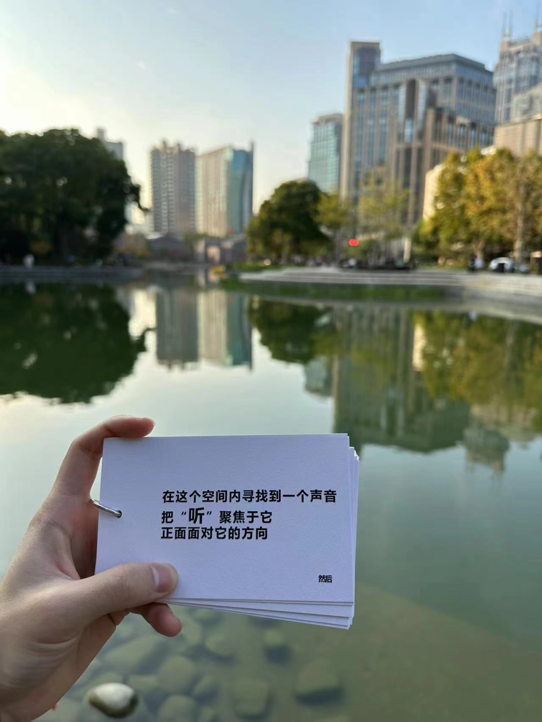 从摇滚乐、剧场表演、电子音乐,到基于实地录音的声境创作,殷漪的探索逐渐由音乐走向更开阔的音声领域与实践范畴,而他本次驻留创作的两件作品《从 到新天地》与《邻居》亦凝缩了他近年对于声音的认知与反复思考。驻留期间殷漪策划了面向公众的“我听到了”声音漫步工作坊,带领参与者进行了声音行走与聆听练习,同时他希望再增加一个面向以声音为工作内容或方法的专业人士的工作坊,实现相互交流并尽可能以某种途径将他们的工作状态呈现出来,这一构想最终演变为《从 到新天地》这件作品。