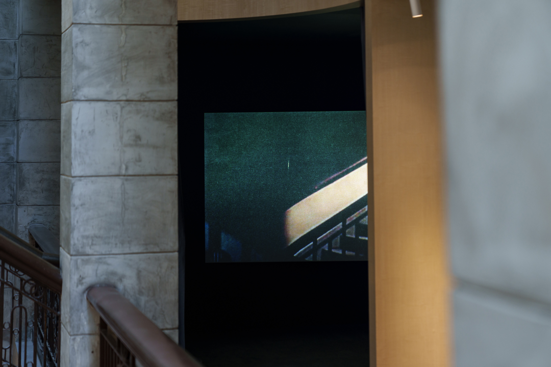 在图像的处理上雷磊则采取了更多的干预手法让这一击鼓传花的游戏得以实现,无论是在唱片上进行摩擦制造噪音,还是将胶片抽帧打印,以白色颜料涂抹再以定格动画的方式连接在一起,雷磊以实验电影中常用的手法对媒介的本体与图像的内容进行干预,长时的黑屏则像眨眼瞬间提供的寂静与沉默,以更强的空间感和更慢的节奏将观者从沉入任何叙事的意图不断推回到黑暗的展厅中。“我觉得最重要的是时刻提醒观众不要进入图像的内部叙事中,如果观者不断地被推出这个造梦的黑暗空间并意识到艺术家在玩耍这些材料,而不是很容易地进入到一个好莱坞式的经典叙事或煽情之中,这种击鼓传花的游戏才能够成立,观众才能跳出故事外把画外音或是字卡等所有的材料平等地看待。对这种对抗性的使用使我们不是以复古或时代的角度来看待这些图像,而是站在今天的视角与知识背景下去重新评价这些图像。”