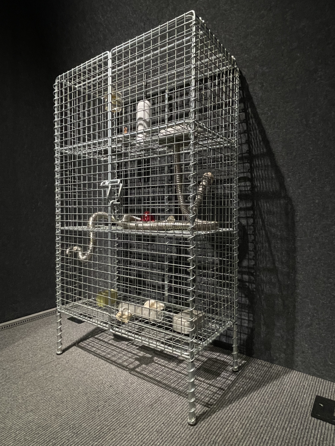 《RFID》中的芯片被运用于仓储物流、含有贵重物品信息的防盗射频识别标签或ETC中,如同今日手机作为现代人的器官延伸,象征权力框架的芯片替代并操控了物体或身体的在场,而越来越微细精巧的形态让这种渗透式管理愈加隐形,而人也从被动地接受逐渐转变为主动地顺从。高磊放大了这一权力结构,并以注射器和颜料对其进行了填充,“只有注射器才能精准地控制颜料的流动填充这些回路的缝隙”,高磊童年回忆中在家长的意志与许可下穿刺入身体的注射器作为权力的重要象征物在他的创作中反复出现。在这个仅容一人站立或躺卧的幽闭U型构件中,观者会感到来自两个世界的压迫感,无论是面向过去世界产生的眩晕或是被未来裹挟的危险,它们共同构成了技术宰制境遇中的某种永久性标本。