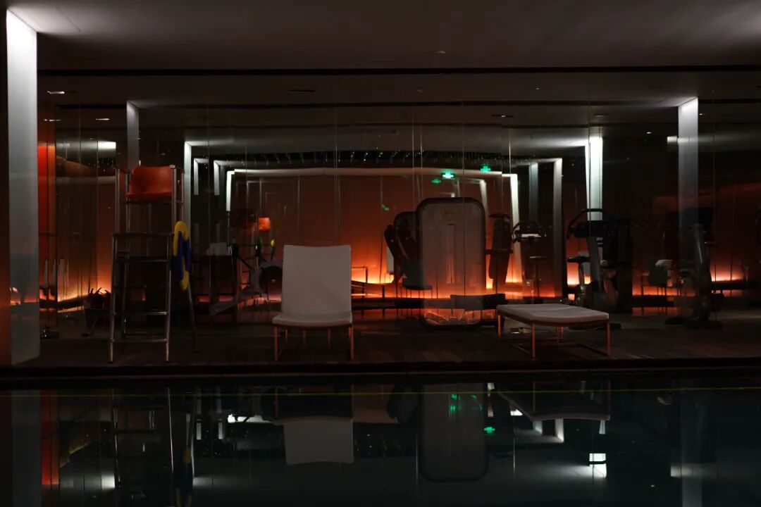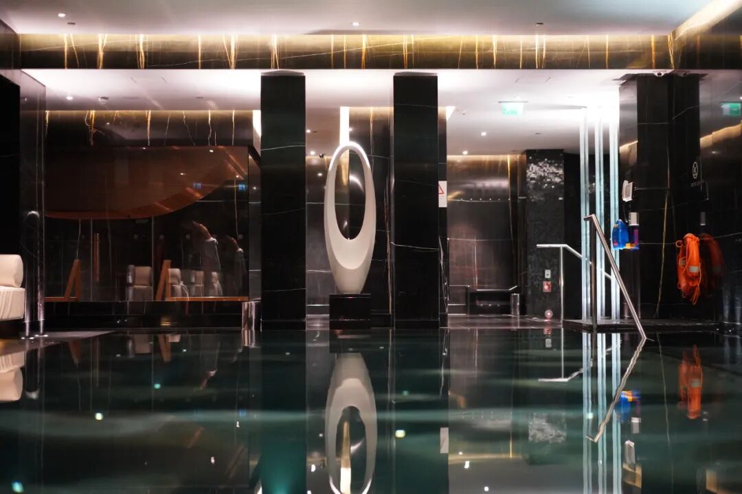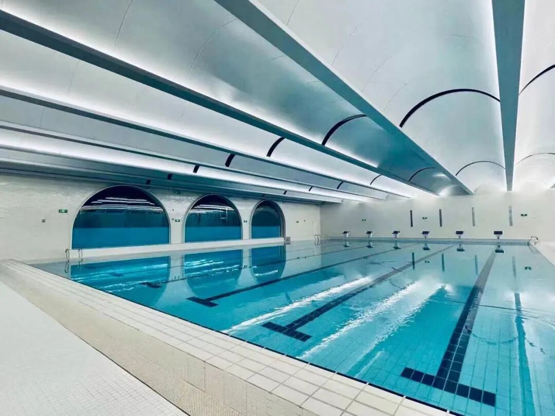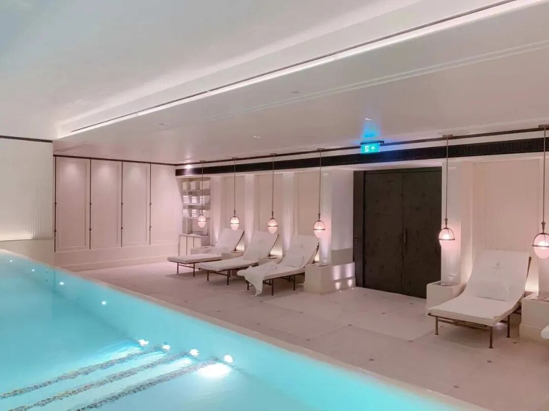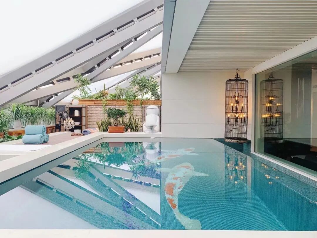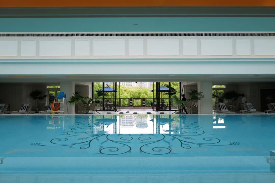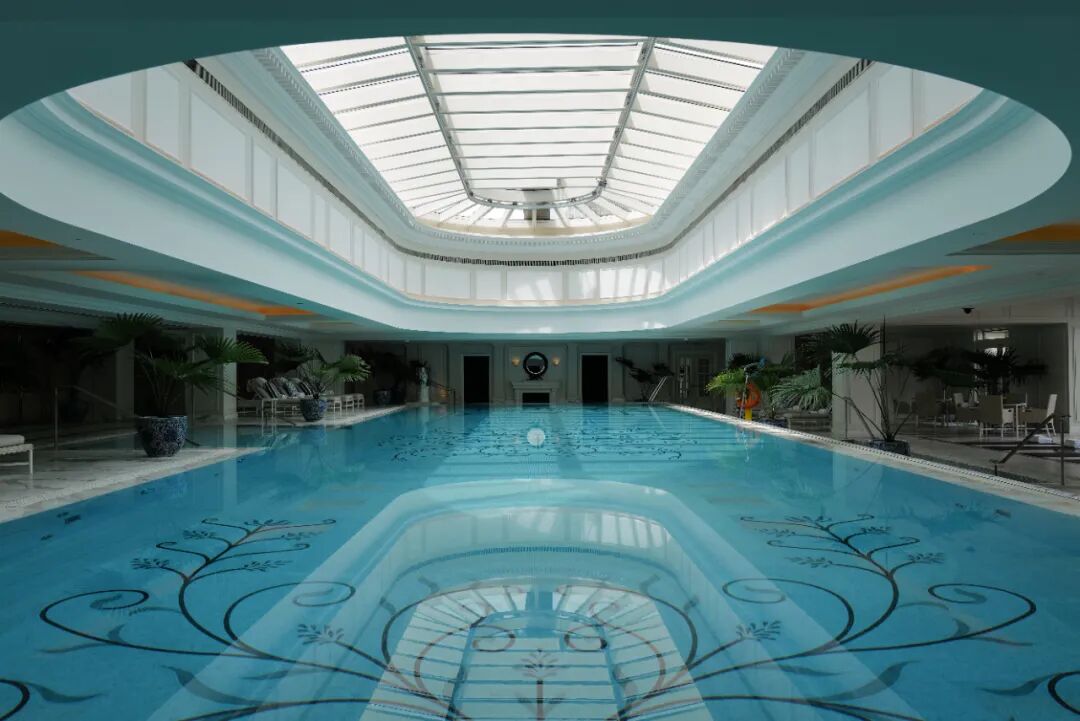 这座泳池尺寸和形态都极为规整,上有玻璃穹顶守护,推门可至直面原英国领事馆花园的大露台。全池都浸润在自然光和象牙色中,池底既有贝母色马赛克,也植有水下音乐系统,当阳光洒满池底时,畅游起来有音符和缤纷的光晕作伴,一切都太梦幻。