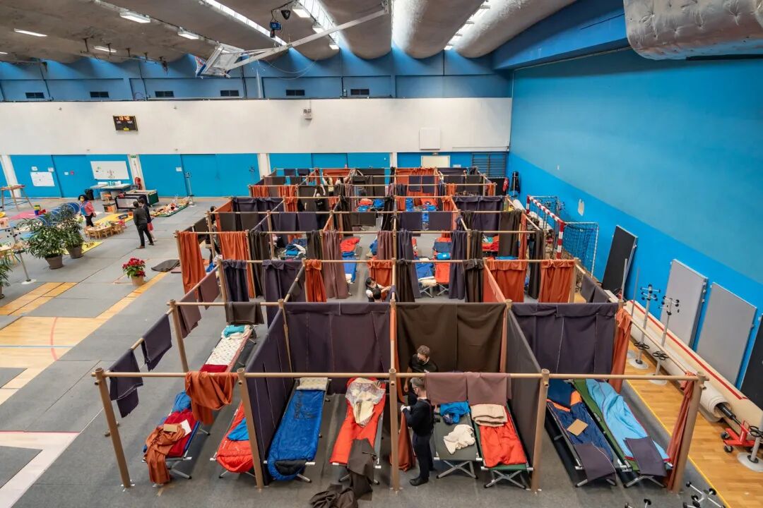 3 月初,在实际进场地搭建之前,建筑师志愿者团队曾在波兰的弗罗茨瓦夫科学与技术大学中组装了纸质隔断避难所原型,并将单个单元的尺寸调整为2.3m x 2m。