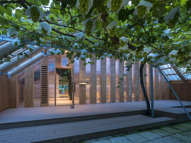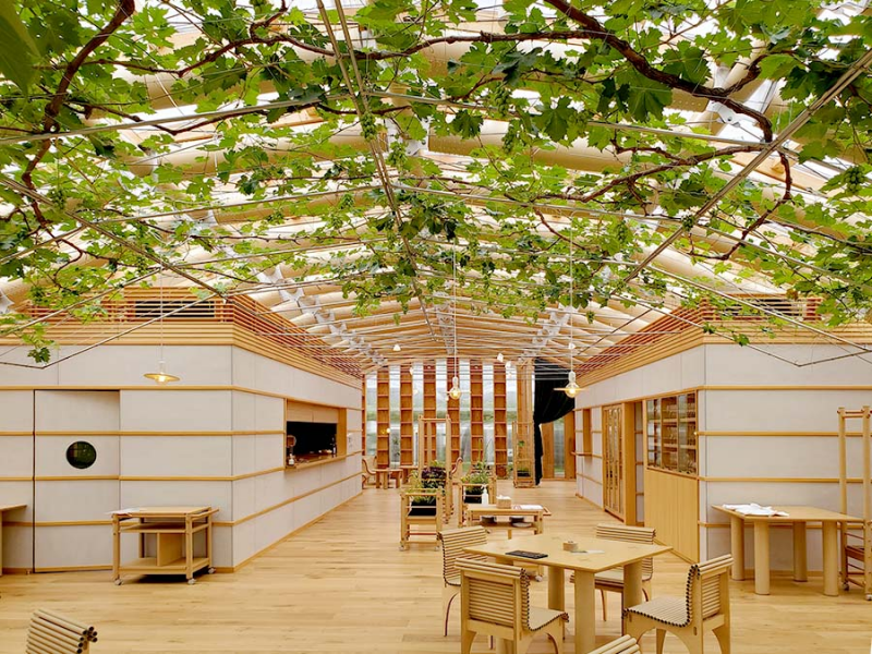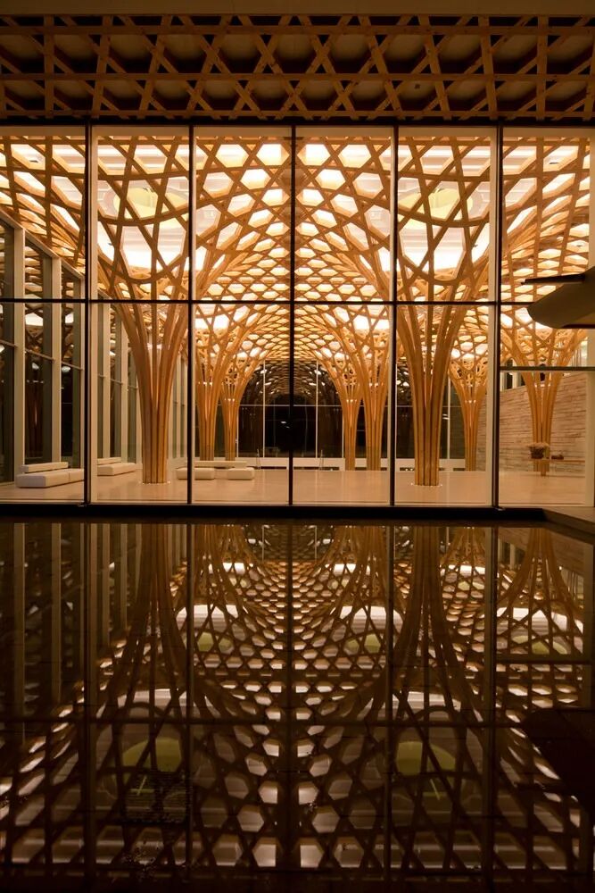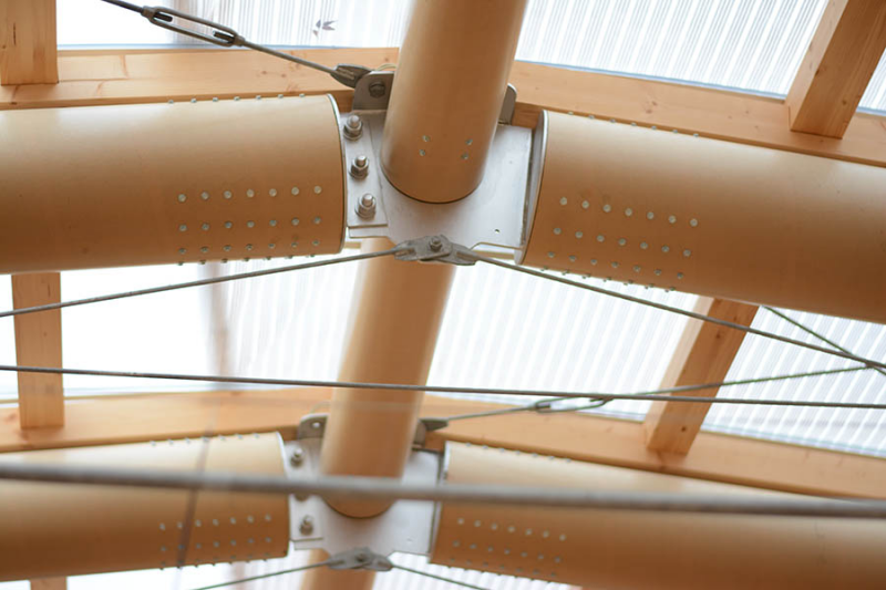 在竞赛阶段,通过“竹屋顶”的关系,并设计了一个木材与钢混合的结构;但在赢得竞赛之后,正如上面提到的,最终仍采用了全部木结构的屋顶设计。