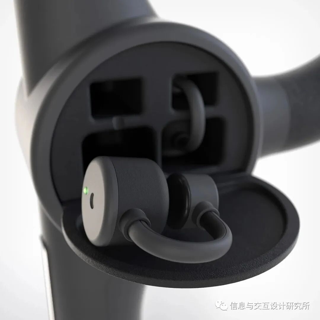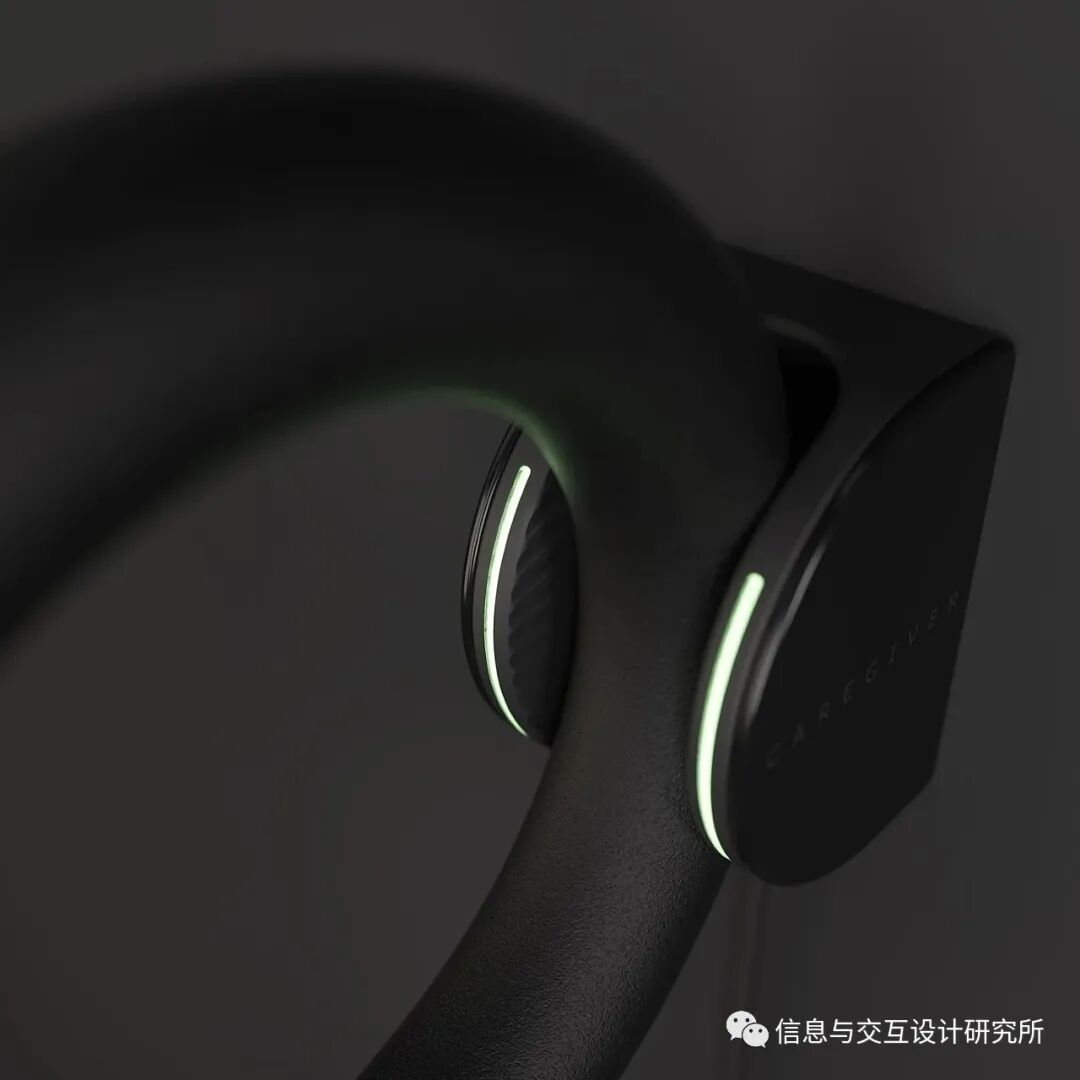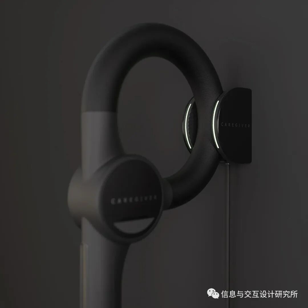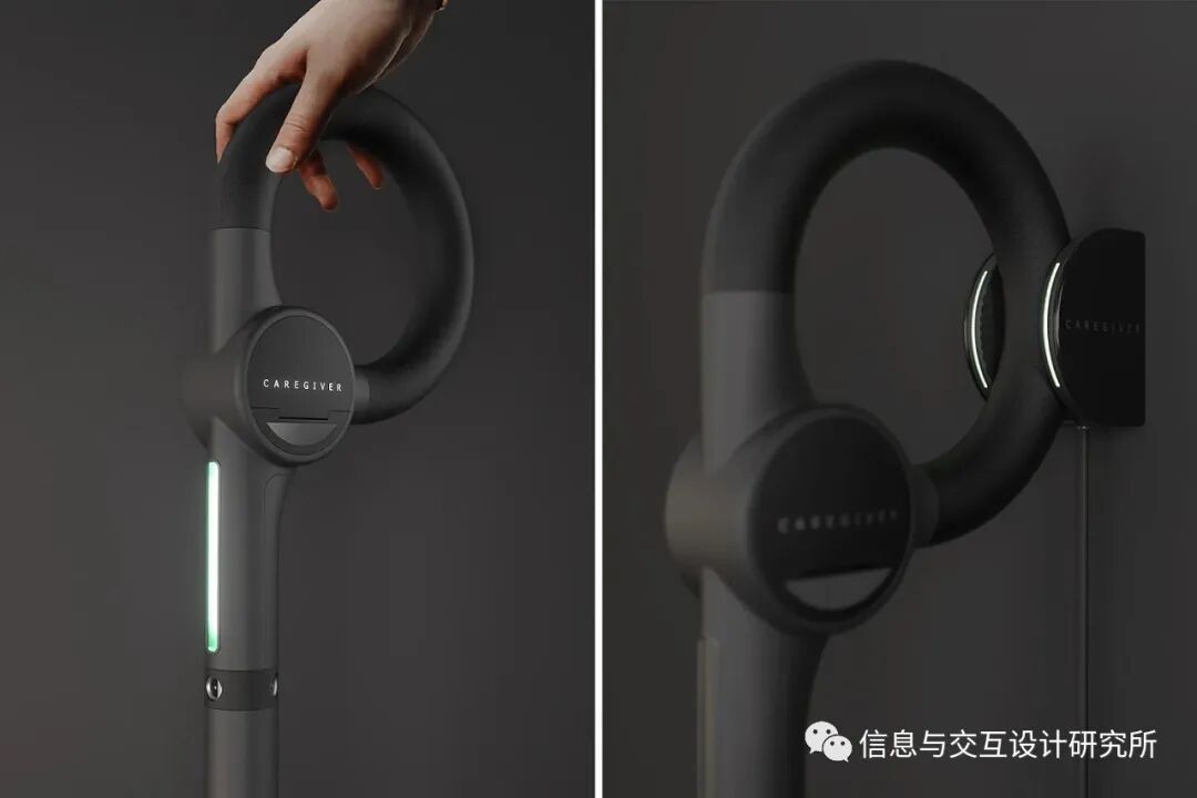 不使用时,Caregiver 可停靠在其无线充电底座中充电。与看起来很古老的手杖不同,Caregiver 是一款非常漂亮、最先进的步行设备,具有极简的未来主义设计语言。它有一个适用于不同身高人群的伸缩式高度调节机制,并且在前面有一个通知灯,它会发出光亮,让其他人知道老人的存在。