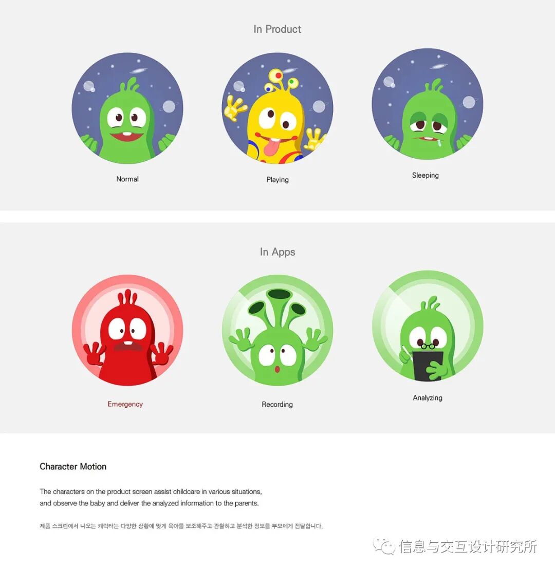 产品屏幕上的字符有助于在各种情况下照顾孩子,观察婴儿并将分析后的信息传递给父母。