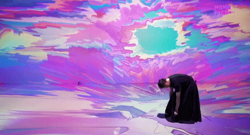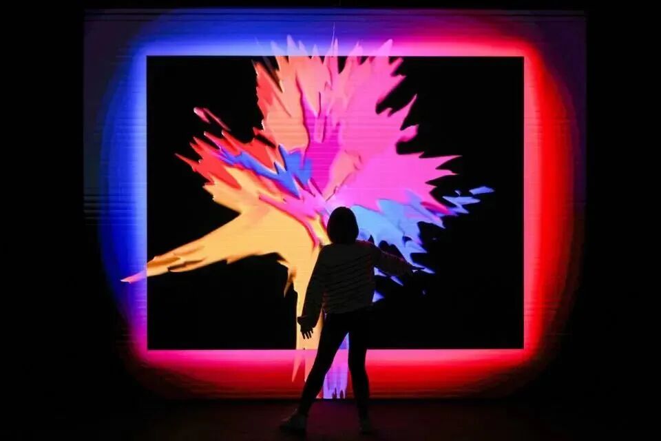 这些视觉像素来源于AI与日常世界生活的记录,比如大自然的高山流长,白云变化,动植物的生命活动……,形成千变万化的视觉源泉。在整个空间的画布屏幕、墙壁,都被观众的尽情互动而改变创作。